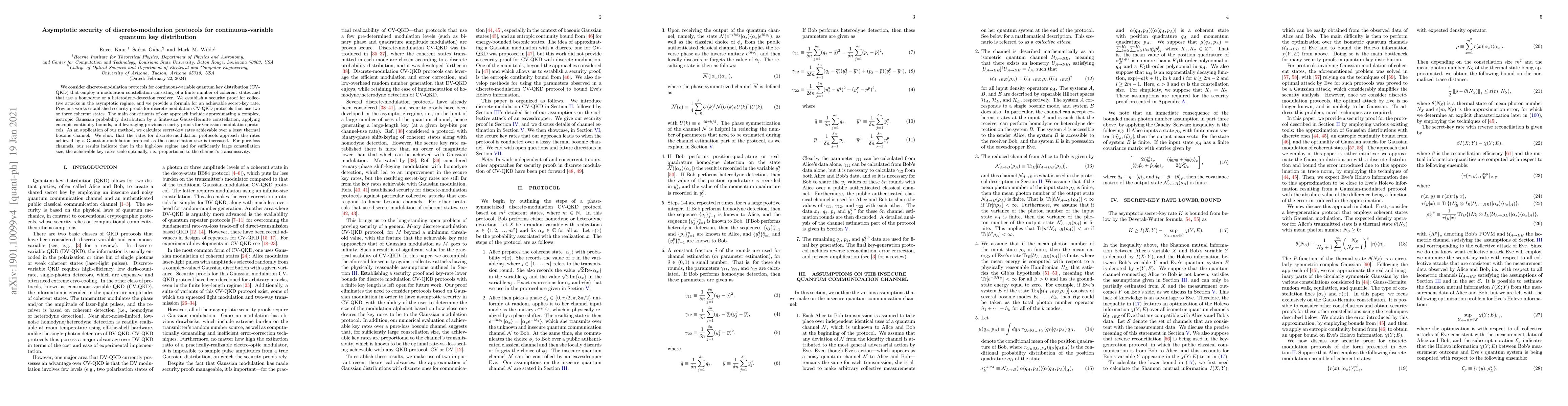This paper establishes security proofs for discrete-modulation protocols in continuous-variable quantum key distribution (CV-QKD) against collective attacks in the asymptotic regime, providing a formula for achievable secret-key rates. The approach leverages approximations of Gaussian distributions and entropic continuity bounds, showing that discrete-modulation rates approach Gaussian-modulation rates with larger constellations.
