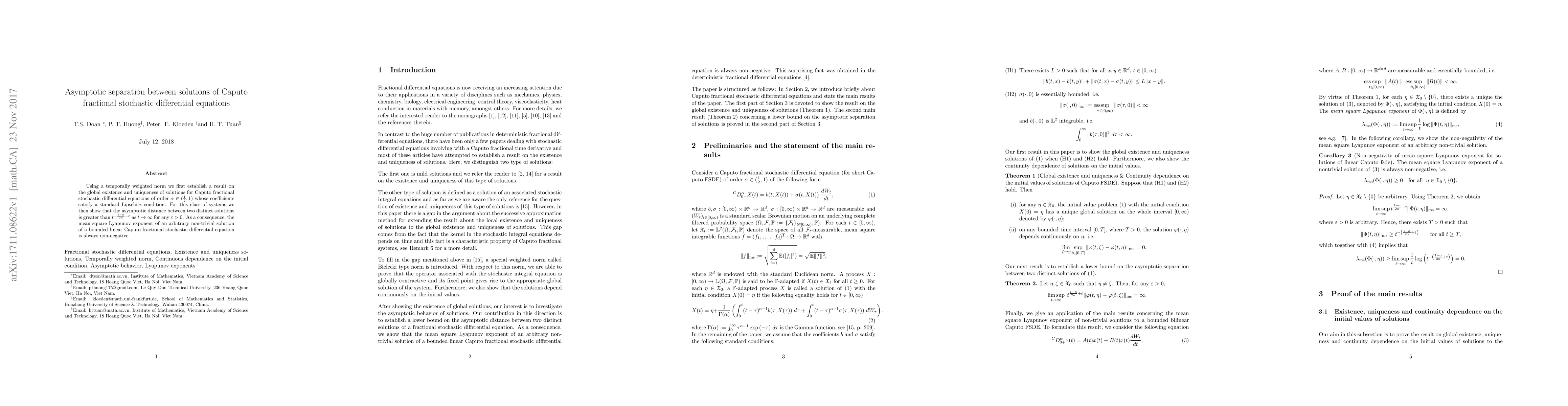 This paper proves global existence and uniqueness for Caputo fractional stochastic differential equations with coefficients satisfying a Lipschitz condition. It demonstrates asymptotic separation between distinct solutions, showing they diverge as $t^{-\frac{1-\alpha}{2\alpha}-\eps}$ for large $t$, leading to a non-negative mean square Lyapunov exponent.