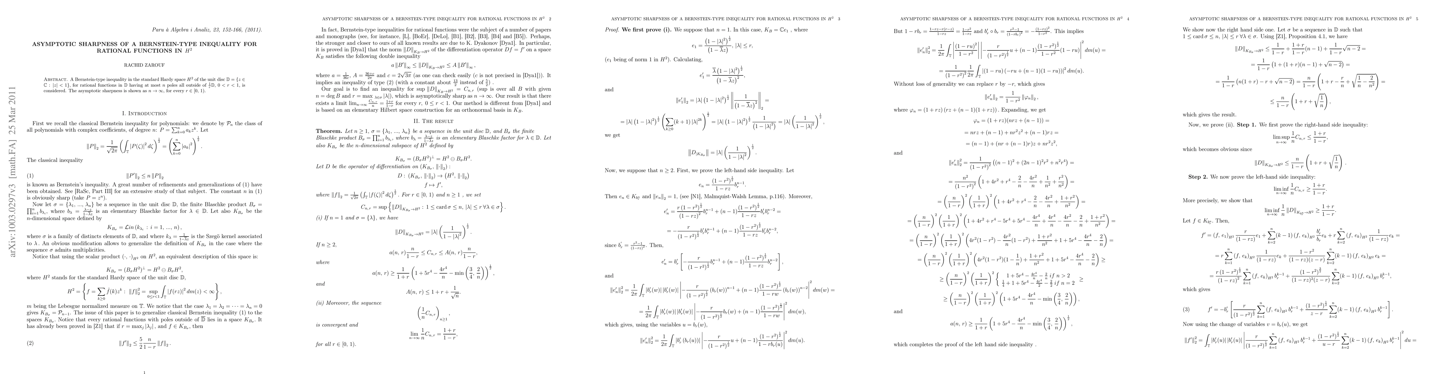 Summary: This paper investigates the asymptotic behavior of a Bernstein-type inequality for rational functions in the Hardy space H^{2} of the unit disc, focusing on the sharpness of the inequality as the number of poles increases. The results demonstrate the precise asymptotic limits of the inequality under specified conditions.
