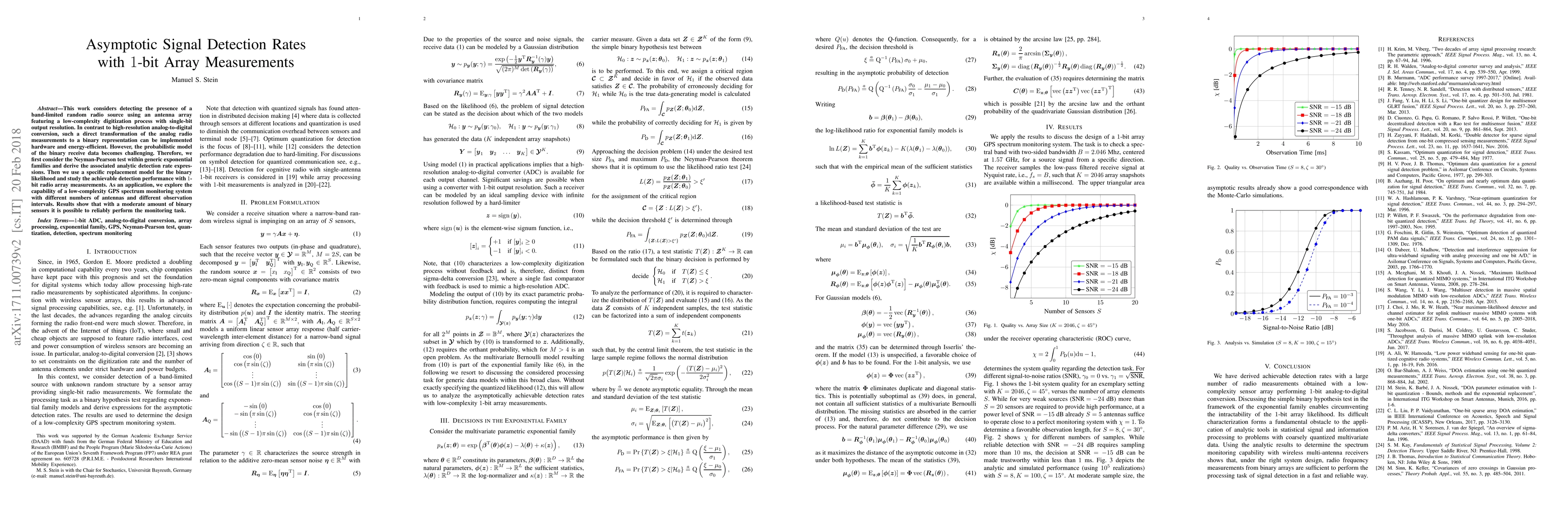 This paper investigates the detection of a band-limited radio source using a low-complexity 1-bit antenna array, deriving analytic detection rate expressions and demonstrating its application in a GPS spectrum monitoring system, showing reliable performance with a moderate number of binary sensors.