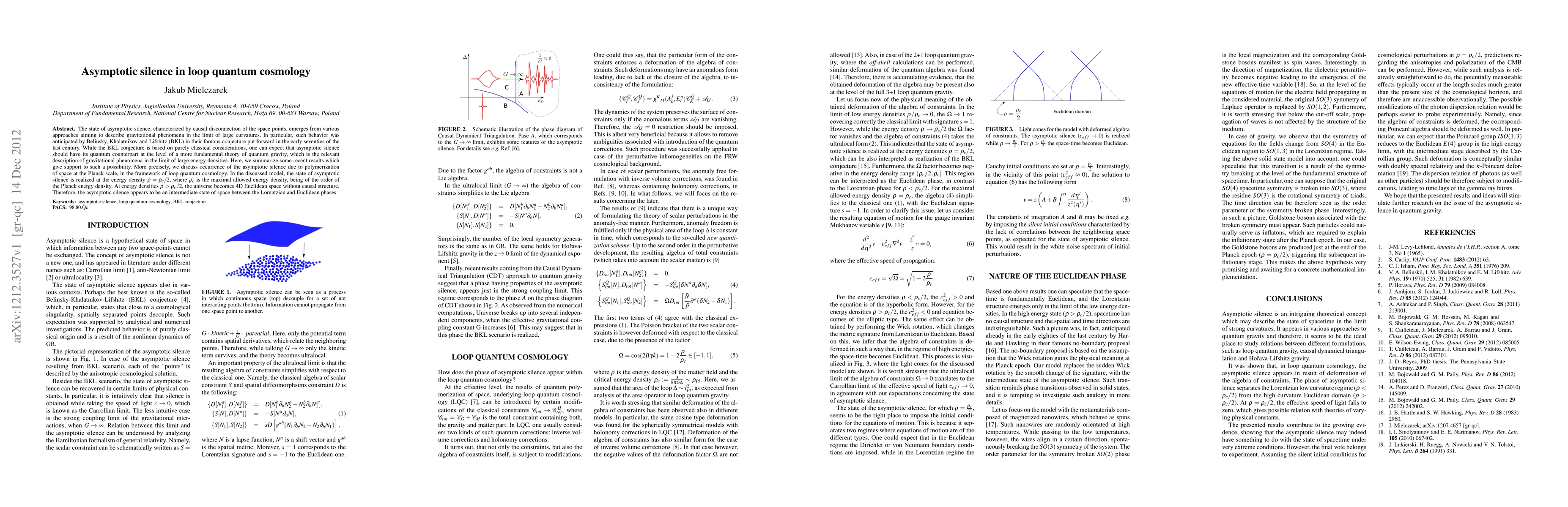 This paper explores the concept of asymptotic silence in loop quantum cosmology, demonstrating that it emerges due to the polymerization of space at the Planck scale. The study shows that at energy densities above half the maximal allowed density, the universe transitions into a 4D Euclidean space lacking causal structure, suggesting an intermediate state between Lorentzian and Euclidean phases.