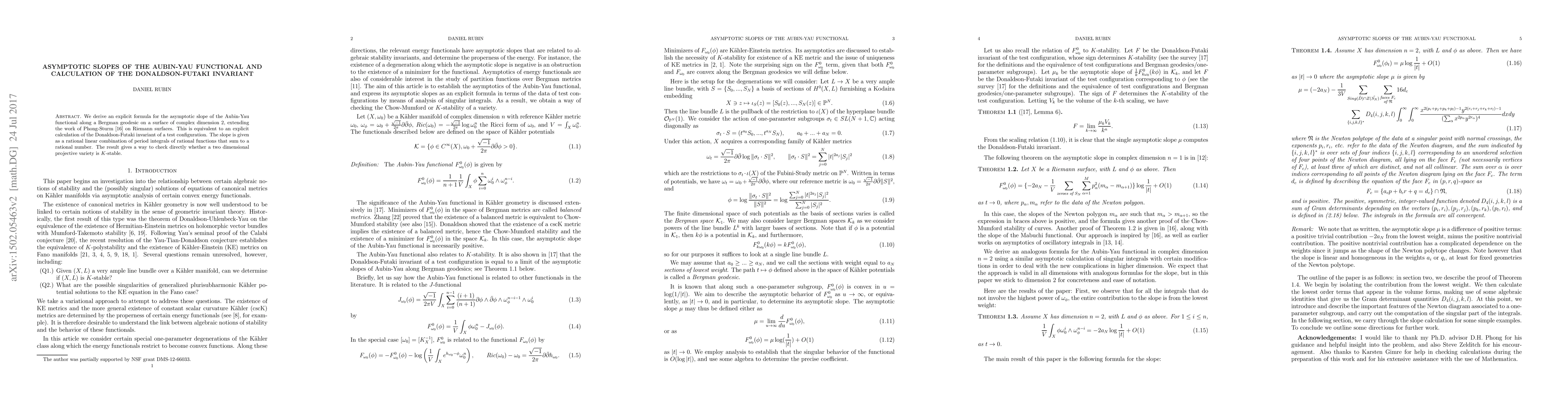 Summary: The paper derives an explicit formula for the asymptotic slope of the Aubin-Yau functional on a complex surface, extending previous results. This calculation also provides an explicit method for determining the Donaldson-Futaki invariant, offering a direct test for K-stability in two-dimensional projective varieties.