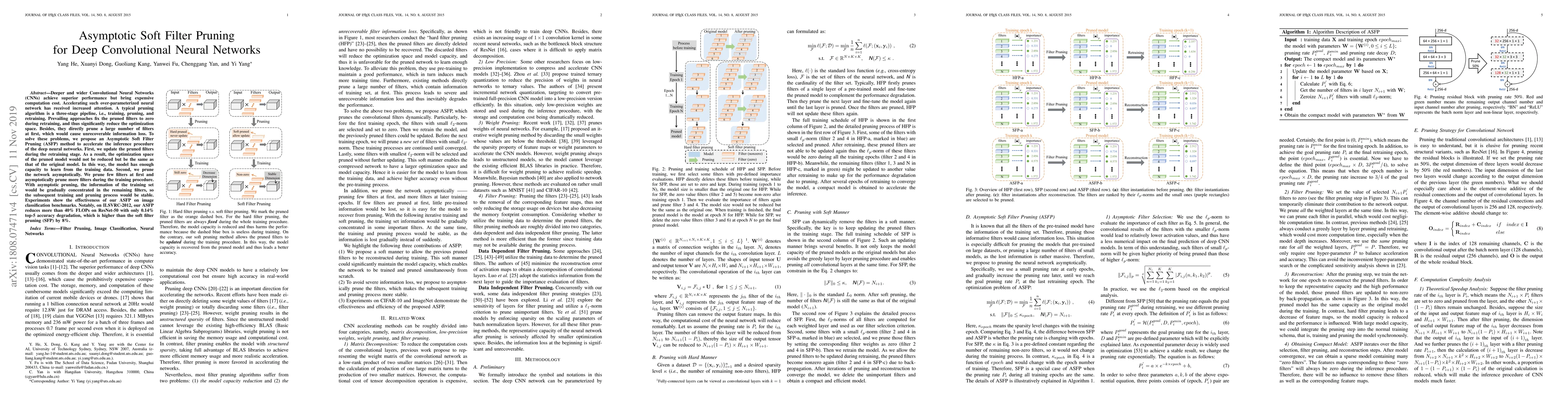 The paper proposes Asymptotic Soft Filter Pruning (ASFP) to accelerate deep CNNs by dynamically updating pruned filters during retraining and gradually pruning filters throughout the training process, achieving significant reduction in computational costs with minimal accuracy loss. ASFP demonstrates superior performance compared to traditional soft filter pruning on image classification benchmarks.