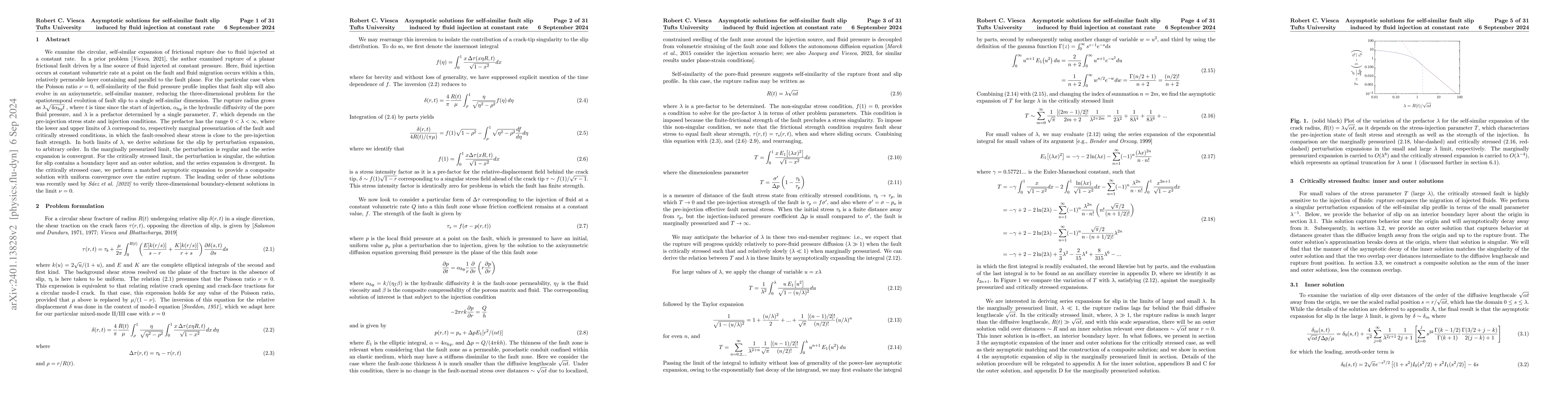 This paper investigates the self-similar expansion of frictional rupture caused by fluid injected at a constant rate into a fault plane. The study finds that under specific conditions, fault slip evolves in a manner that reduces the problem to a single self-similar dimension, with rupture radius growing as $\lambda \sqrt{4\alpha_{hy} t}$. The authors derive asymptotic solutions for fault slip in both marginal and critically stressed conditions, employing matched asymptotic expansion for the latter.