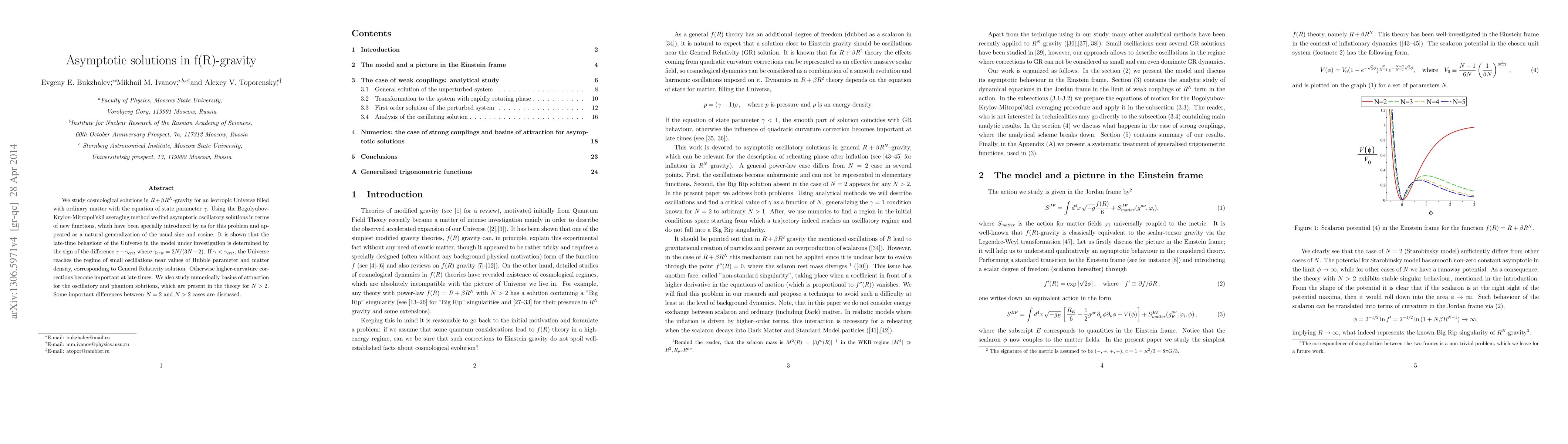 We study cosmological solutions in $R + \beta R^{N}$-gravity for an isotropic Universe filled with ordinary matter with the equation of state parameter $\gamma$. Using the Bogolyubov-Krylov-Mitropol'skii averaging method we find asymptotic oscillatory solutions in terms of new functions, which have been specially introduced by us for this problem and appeared as a natural generalization of the usual sine and cosine. It is shown that the late-time behaviour of the Universe in the model under investigation is determined by the sign of the difference $\gamma-\gamma_{crit}$ where $\gamma_{crit}=2N/(3N-2)$. If $\gamma < \gamma_{crit}$, the Universe reaches the regime of small oscillations near values of Hubble parameter and matter density, corresponding to General Relativity solution. Otherwise higher-curvature corrections become important at late times. We also study numerically basins of attraction for the oscillatory and phantom solutions, which are present in the theory for $N>2$. Some important differences between $N=2$ and $N>2$ cases are discussed.