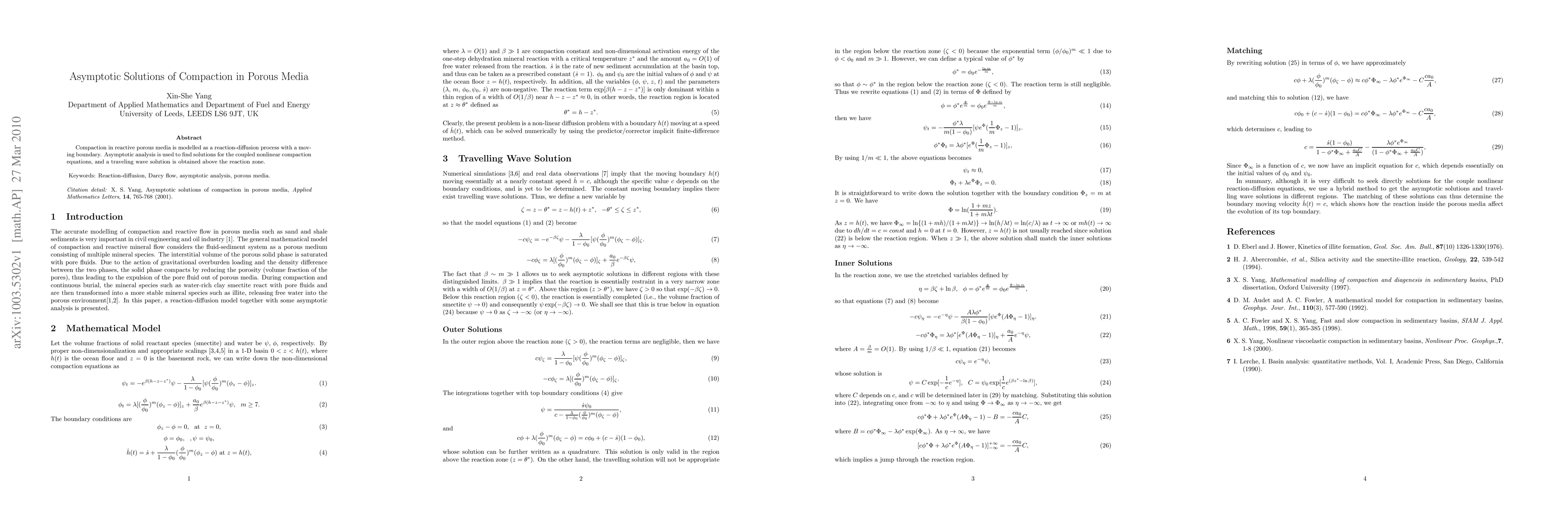 This paper models compaction in reactive porous media as a reaction-diffusion process with a moving boundary. Using asymptotic analysis, it derives solutions for the coupled nonlinear compaction equations, revealing a traveling wave solution above the reaction zone.