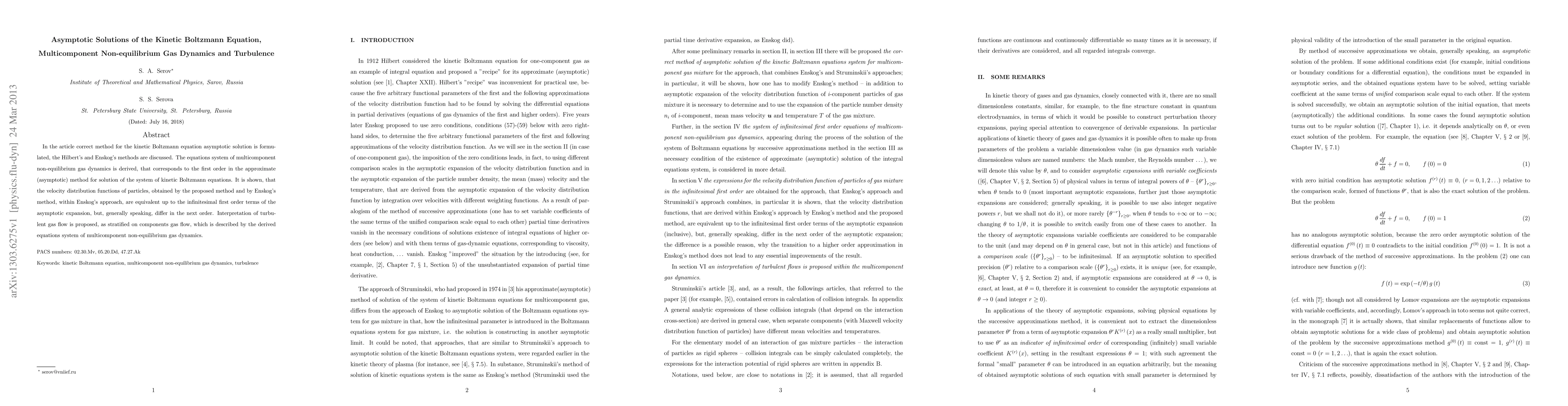 This paper formulates an asymptotic solution method for the kinetic Boltzmann equation, comparing it with Hilbert's and Enskog's methods. It derives a multicomponent non-equilibrium gas dynamics system and proposes a turbulent gas flow interpretation as stratified on components, showing equivalence in first-order terms but differences in higher orders.