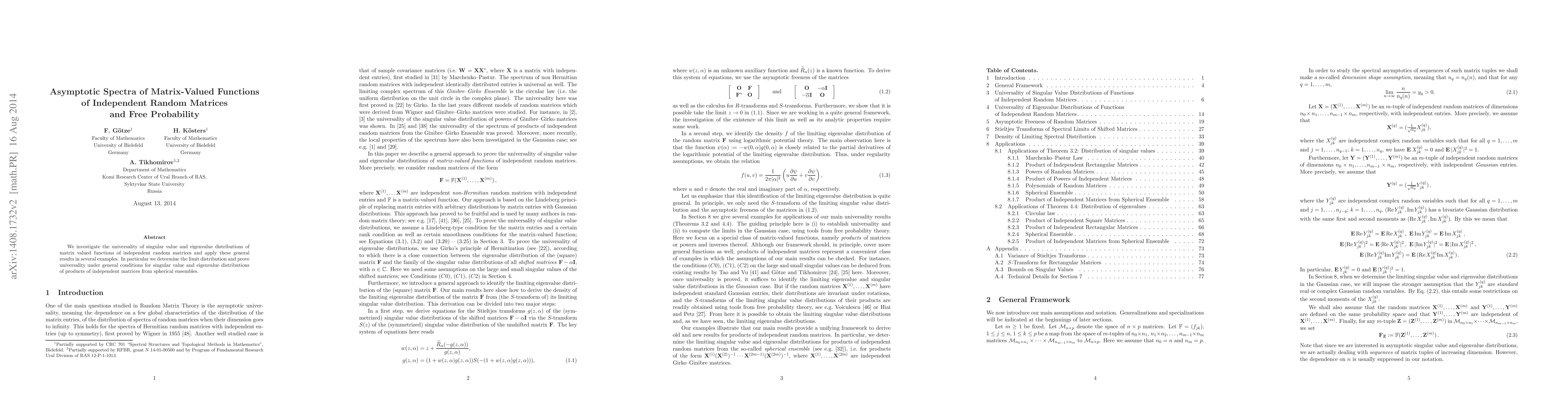 This paper explores the universality of singular value and eigenvalue distributions for matrix-valued functions of independent random matrices, focusing on spherical ensembles. It determines the limit distribution and proves universality under general conditions for these distributions.