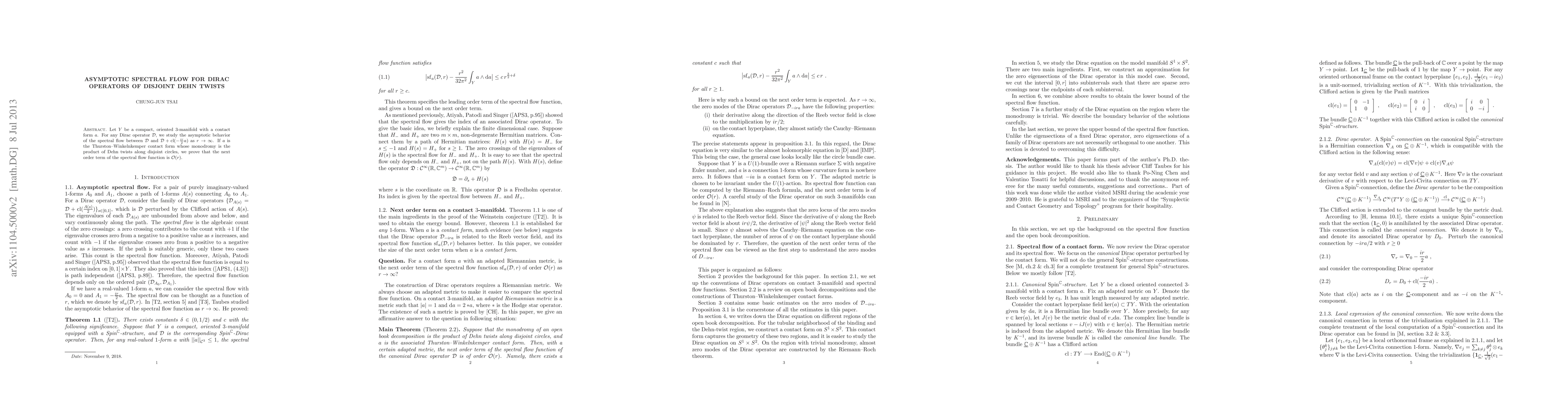 This paper investigates the asymptotic spectral flow for Dirac operators in a compact, oriented 3-manifold with a contact form, focusing on the case where the contact form corresponds to disjoint Dehn twists. The authors prove that the next order term in the spectral flow function is proportional to r as r approaches infinity.