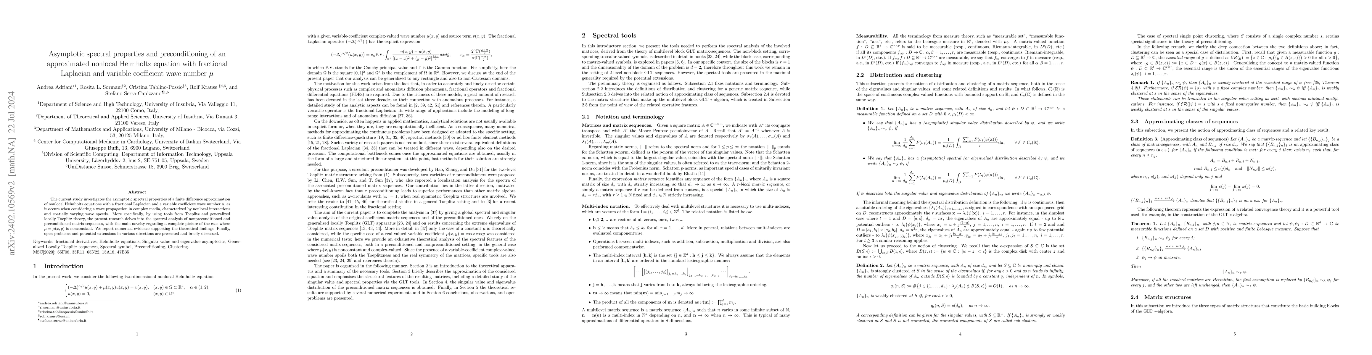 The current study investigates the asymptotic spectral properties of a finite difference approximation of nonlocal Helmholtz equations with a Caputo fractional Laplacian and a variable coefficient wave number $\mu$, as it occurs when considering a wave propagation in complex media, characterized by nonlocal interactions and spatially varying wave speeds. More specifically, by using tools from Toeplitz and generalized locally Toeplitz theory, the present research delves into the spectral analysis of nonpreconditioned and preconditioned matrix-sequences. We report numerical evidences supporting the theoretical findings. Finally, open problems and potential extensions in various directions are presented and briefly discussed.