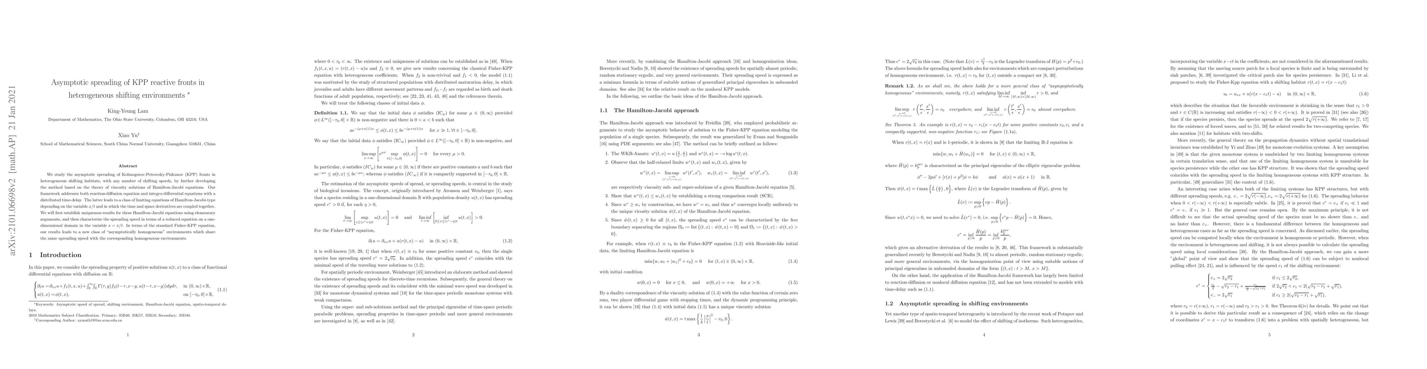 This paper develops a method based on viscosity solutions of Hamilton-Jacobi equations to study the asymptotic spreading of KPP fronts in heterogeneous environments with variable shifting speeds. It establishes uniqueness and characterizes spreading speed through a reduced equation, revealing a new class of "asymptotically homogeneous" environments.