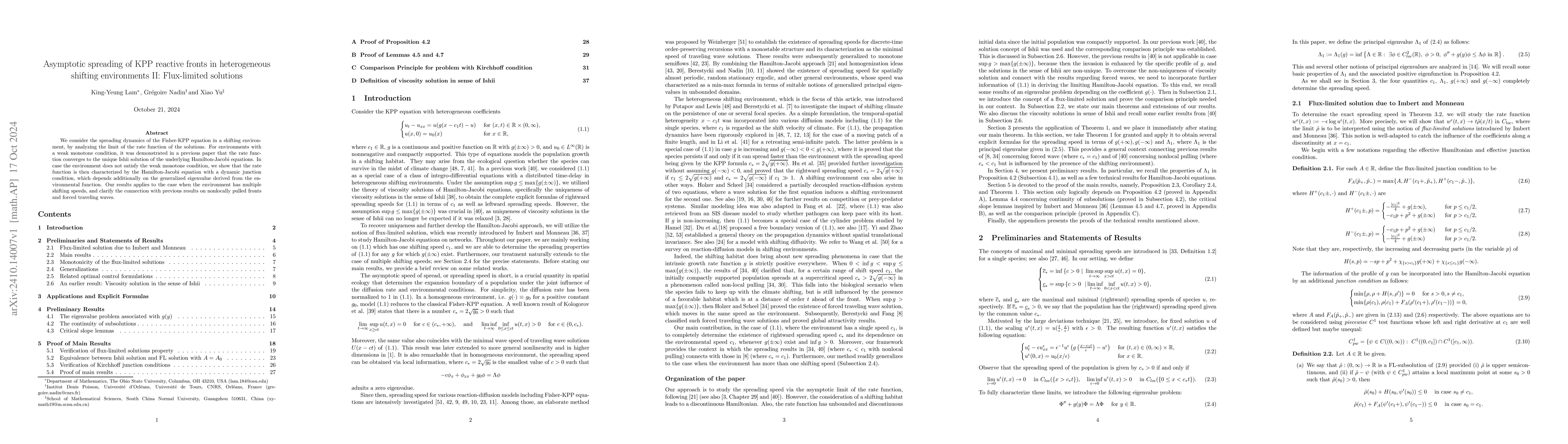 The paper introduces a framework for analyzing the asymptotic spreading of KPP reactive fronts in heterogeneous shifting environments, characterizing the rate function through Hamilton-Jacobi equations with dynamic junction conditions.