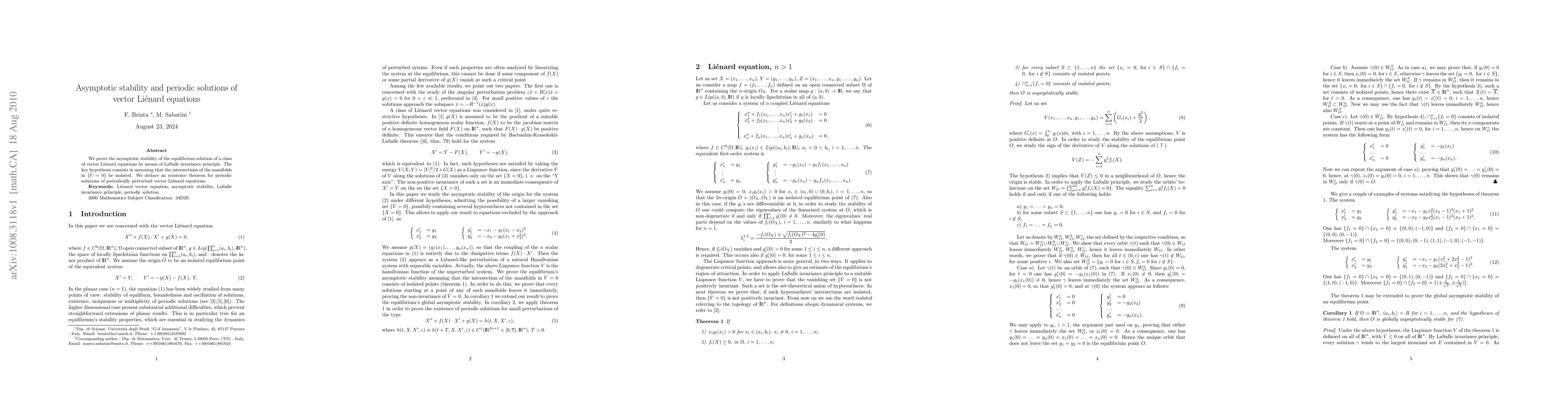 This paper proves the asymptotic stability of equilibrium solutions for vector Liénard equations using the LaSalle invariance principle, assuming isolated intersections of manifolds. It also establishes the existence of periodic solutions for periodically perturbed vector Liénard equations.