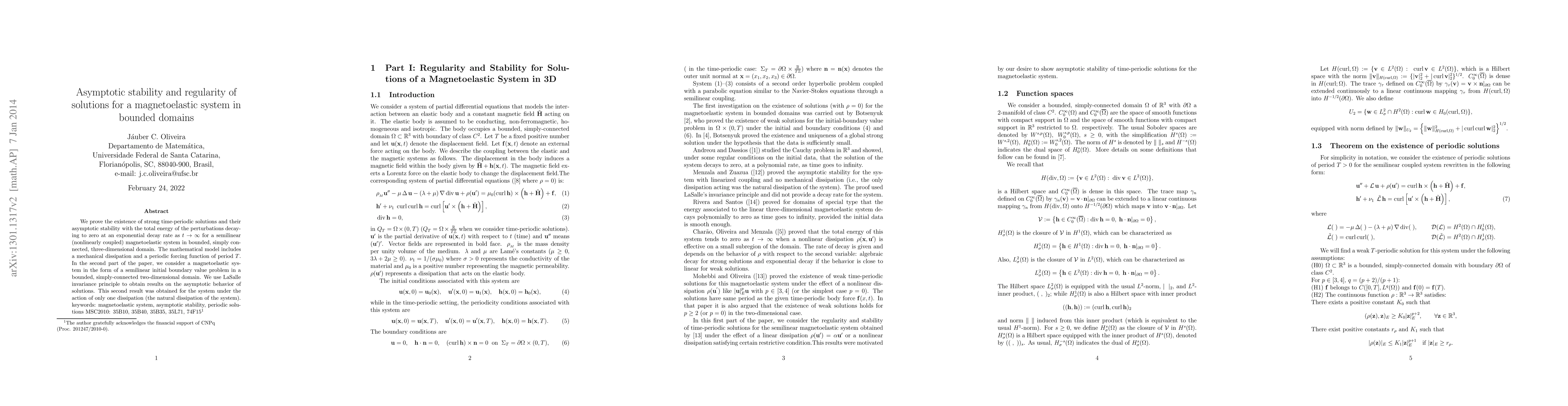 We prove the existence of strong time-periodic solutions and their asymptotic stability with the total energy of the perturbations decaying to zero at an exponential decay rate as $t \rightarrow \infty$ for a semilinear (nonlinearly coupled) magnetoelastic system in bounded, simply connected, three-dimensional domain. The mathematical model includes a mechanical dissipation and a periodic forcing function of period $T$. In the second part of the paper, we consider a magnetoelastic system in the form of a semilinear initial boundary value problem in a bounded, simply-connected two-dimensional domain. We use LaSalle invariance principle to obtain results on the asymptotic behavior of solutions. This second result was obtained for the system under the action of only one dissipation (the natural dissipation of the system).
