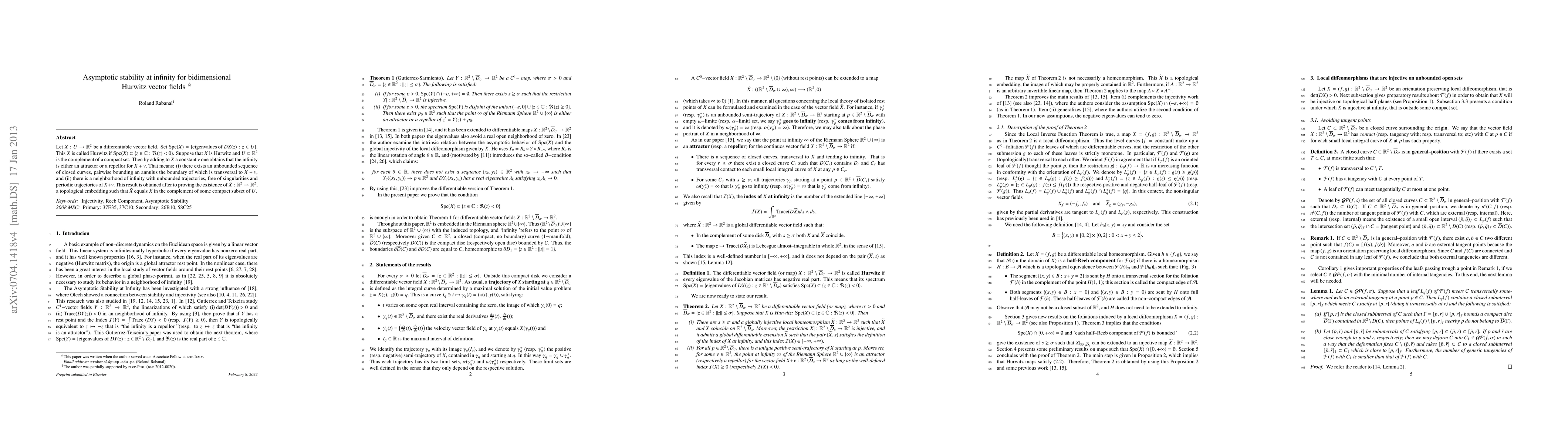 Let $X:U-->R^2$ be a differentiable vector field. Set $Spc(X)={eigenvalues of DX(z) : z\in U}$. This $X$ is called Hurwitz if $Spc(X)\subset{z\in C:\Re(z)<0}$. Suppose that $X$ is Hurwitz and $U\subset R^2$ is the complement of a compact set. Then by adding to $X$ a constant $v$ one obtains that the infinity is either an attractor or a repellor for $X+v.$