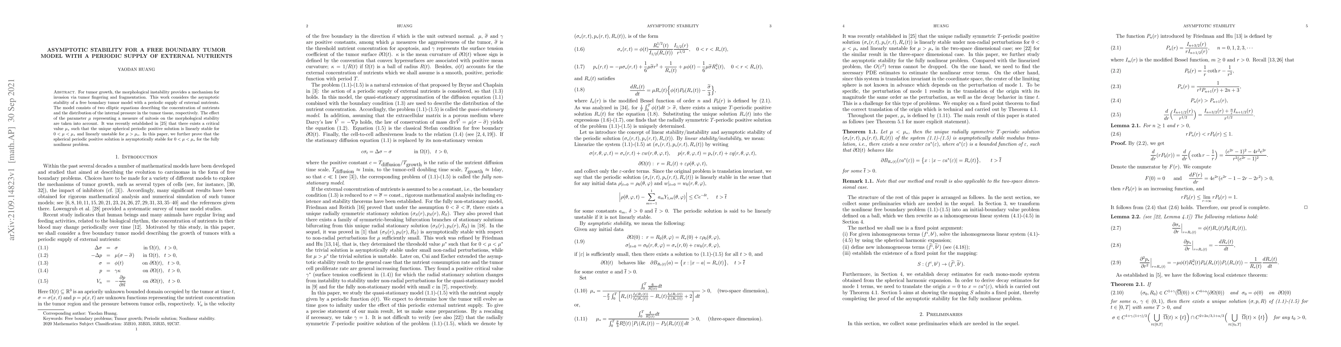 This paper investigates the asymptotic stability of a free boundary tumor model under periodic nutrient supply, showing that the unique spherical periodic solution is asymptotically stable for a critical mitosis parameter range. The study extends previous linear stability findings to the fully nonlinear problem.