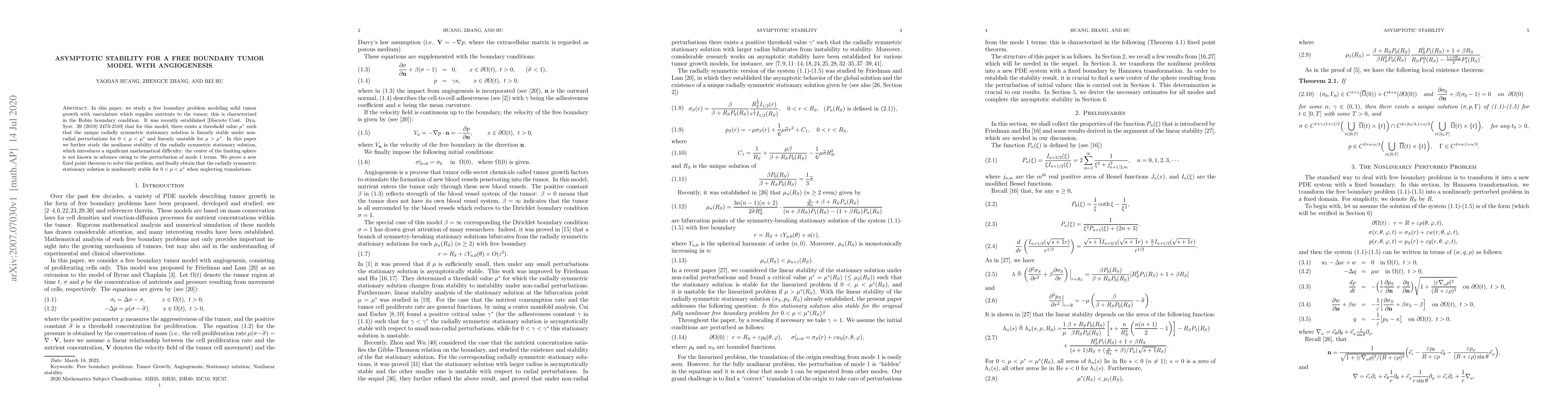 In this paper, we study a free boundary problem modeling solid tumor growth with vasculature which supplies nutrients to the tumor; this is characterized in the Robin boundary condition. It was recently established [Discrete Cont. Dyn. Syst. 39 (2019) 2473-2510] that for this model, there exists a threshold value $\mu^\ast$ such that the unique radially symmetric stationary solution is linearly stable under non-radial perturbations for $0<\mu<\mu^\ast$ and linearly unstable for $\mu>\mu^\ast$. In this paper we further study the nonlinear stability of the radially symmetric stationary solution, which introduces a significant mathematical difficulty: the center of the limiting sphere is not known in advance owing to the perturbation of mode 1 terms. We prove a new fixed point theorem to solve this problem, and finally obtain that the radially symmetric stationary solution is nonlinearly stable for $0<\mu<\mu^\ast$ when neglecting translations.