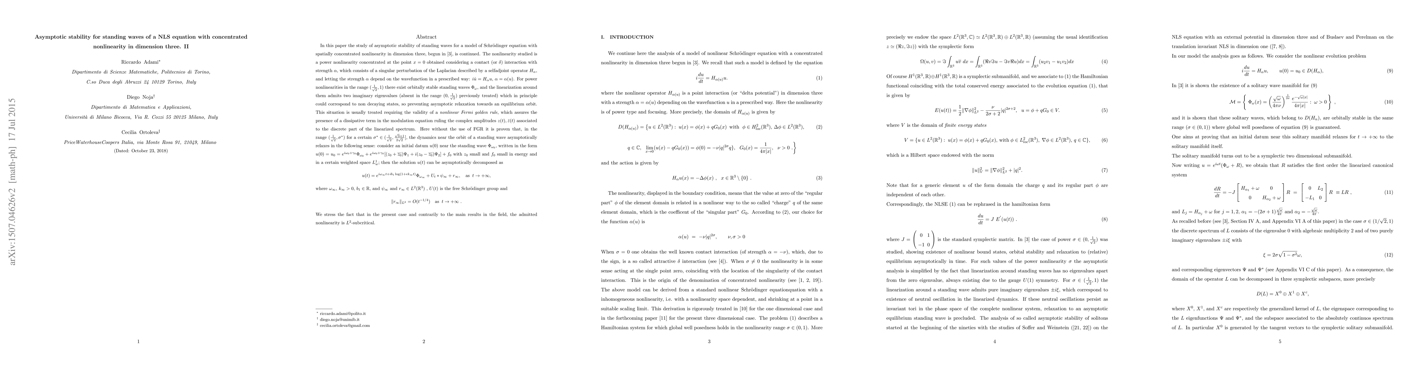 We investigate the asymptotic stability of standing waves for a model of Schr\"odinger equation with spatially concentrated nonlinearity in space dimension three. The nonlinearity studied is a power nonlinearity concentrated at the point $x=0$ obtained considering a contact (or $\delta$) interaction with strength $\alpha$, and letting the strength $\alpha$ depend on the wavefunction in a prescribed way. For power nonlinearities in the range $(\frac{1}{\sqrt 2},1)$ there exist orbitally stable standing waves $\Phi_\omega$, and the linearization around them admits two imaginary eigenvalues which in principle could correspond to non decaying states, so preventing asymptotic relaxation towards an equilibrium orbit. Without using the Fermi Golden Rule we prove that, in the range $(\frac{1}{\sqrt 2},\sigma^*)$ for a certain $\sigma^* \in (\frac{1}{\sqrt{2}}, \frac{\sqrt{3} +1}{2 \sqrt{2}}]$, the dynamics near the orbit of a standing wave asymptotically relaxes towards a standing state. Contrarily to the main results in the field, the admitted nonlinearity is $L^2$-subcritical.