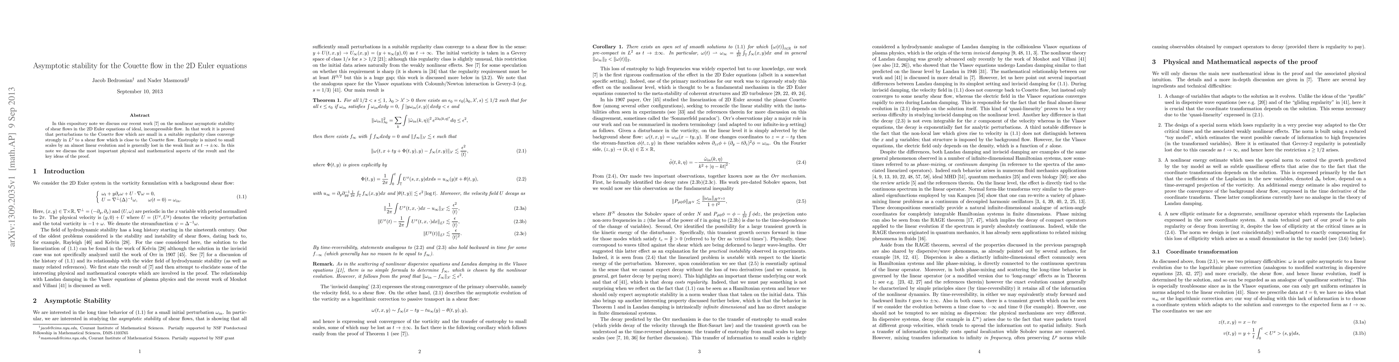In this expository note we discuss our recent work [arXiv:1306.5028] on the nonlinear asymptotic stability of shear flows in the 2D Euler equations of ideal, incompressible flow. In that work it is proved that perturbations to the Couette flow which are small in a suitable regularity class converge strongly in $L^2$ to a shear flow which is close to the Couette flow. Enstrophy is mixed to small scales by an almost linear evolution and is generally lost in the weak limit as t -> +/- infinity. In this note we discuss the most important physical and mathematical aspects of the result and the key ideas of the proof.