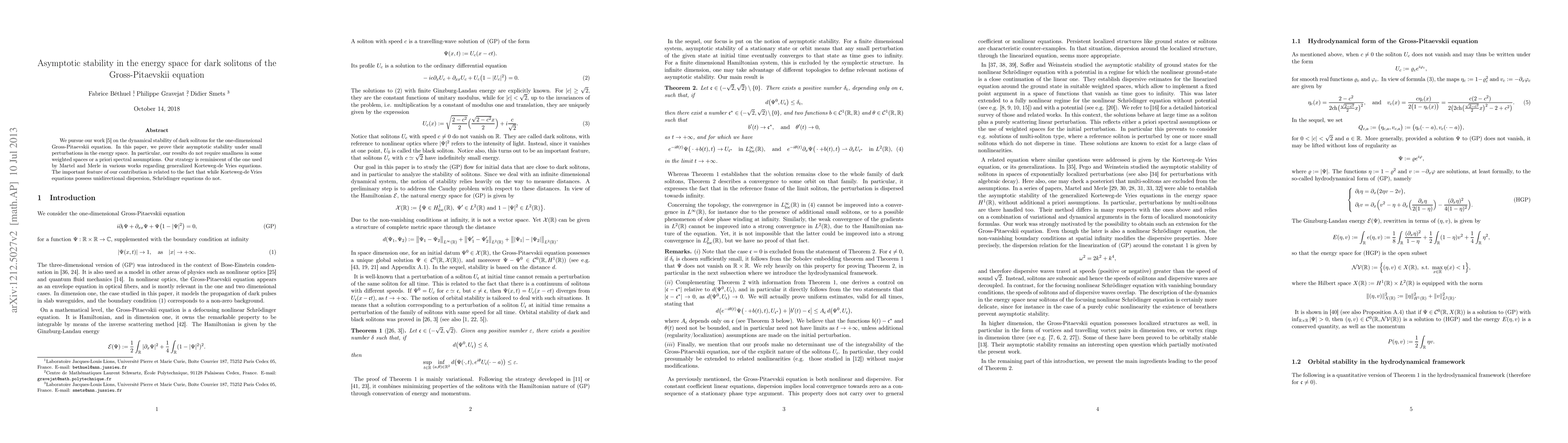 This paper proves the asymptotic stability of dark solitons in the one-dimensional Gross-Pitaevskii equation under small perturbations in the energy space, without requiring smallness in weighted spaces or spectral assumptions. The approach mirrors that of Martel and Merle for generalized Korteweg-de Vries equations, highlighting the unique challenge of Schrödinger equations lacking unidirectional dispersion.