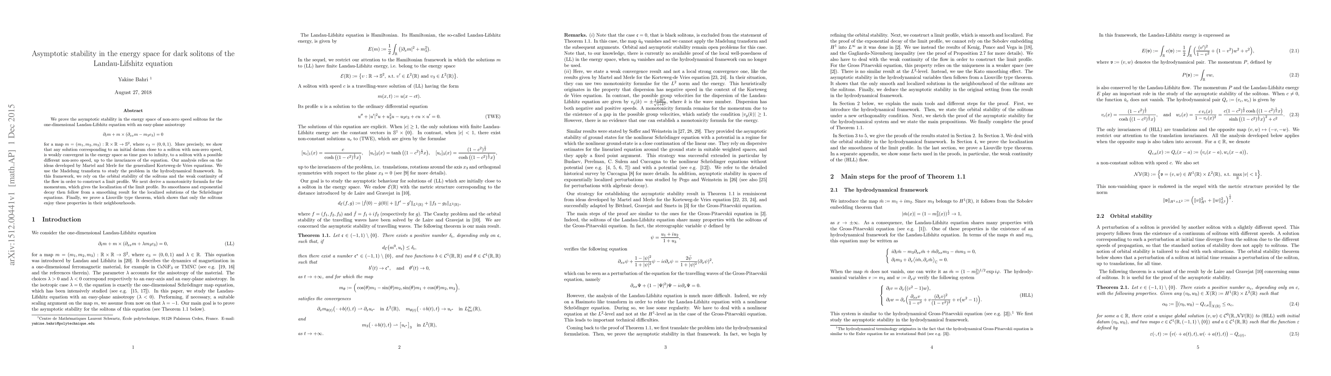 This paper proves the asymptotic stability of non-zero speed solitons for the one-dimensional Landau-Lifshitz equation with easy-plane anisotropy, showing that solutions converge to solitons in the energy space. The analysis employs the Madelung transform and leverages the orbital stability of solitons to establish convergence and smoothness properties.