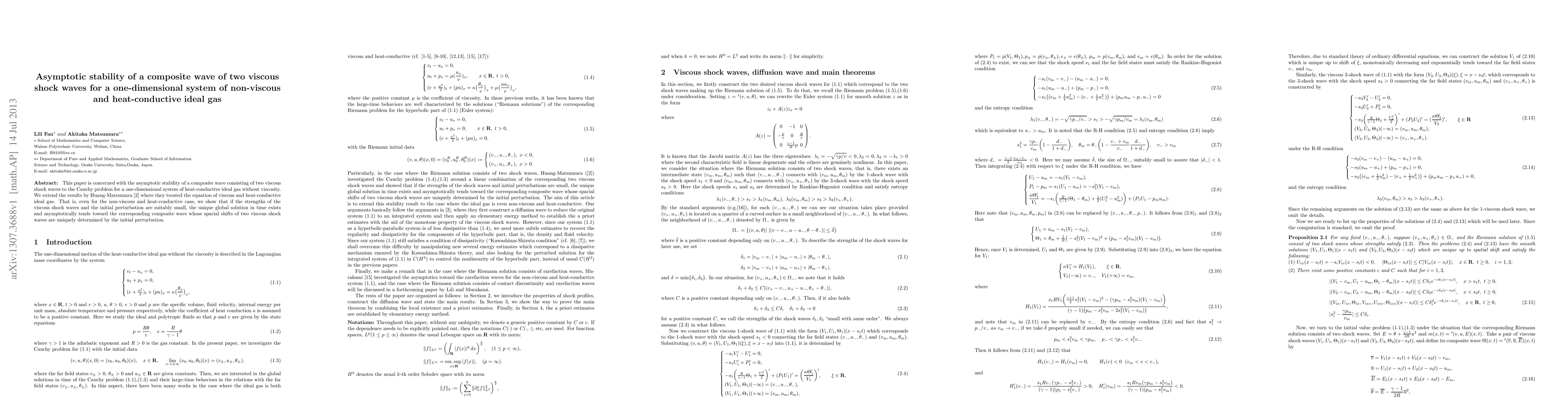 This paper investigates the asymptotic stability of a composite wave made up of two viscous shock waves in a one-dimensional system of non-viscous, heat-conductive ideal gas. It demonstrates that under small initial conditions, the system's unique global solution converges to the composite wave, extending previous results for viscous cases.
