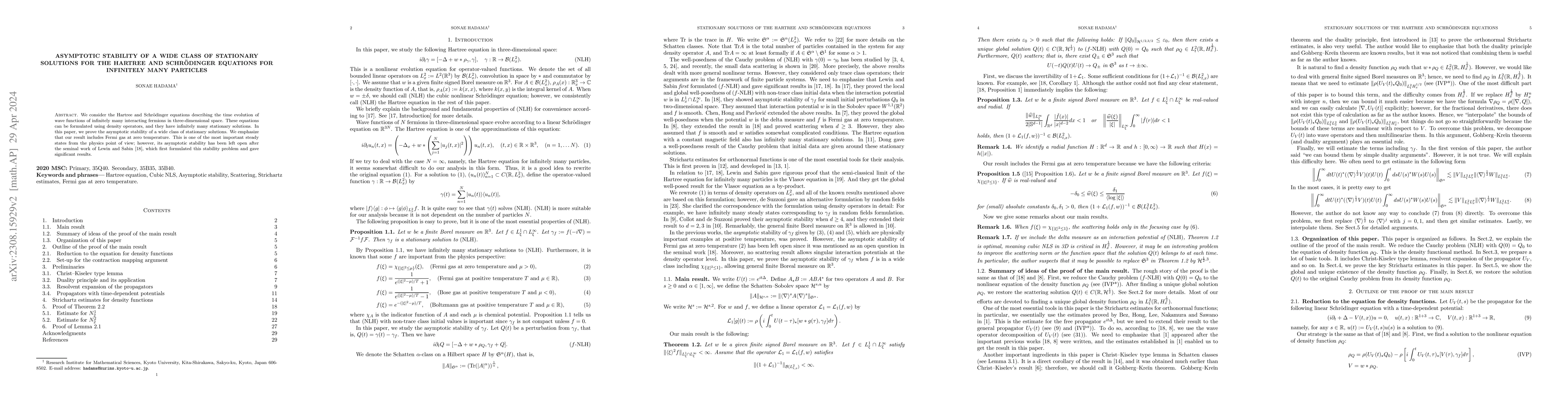 This paper proves the asymptotic stability of a broad class of stationary solutions for the Hartree and Schrödinger equations governing infinitely many interacting fermions, including the crucial Fermi gas at zero temperature. This resolves a longstanding open problem initiated by Lewin and Sabin.