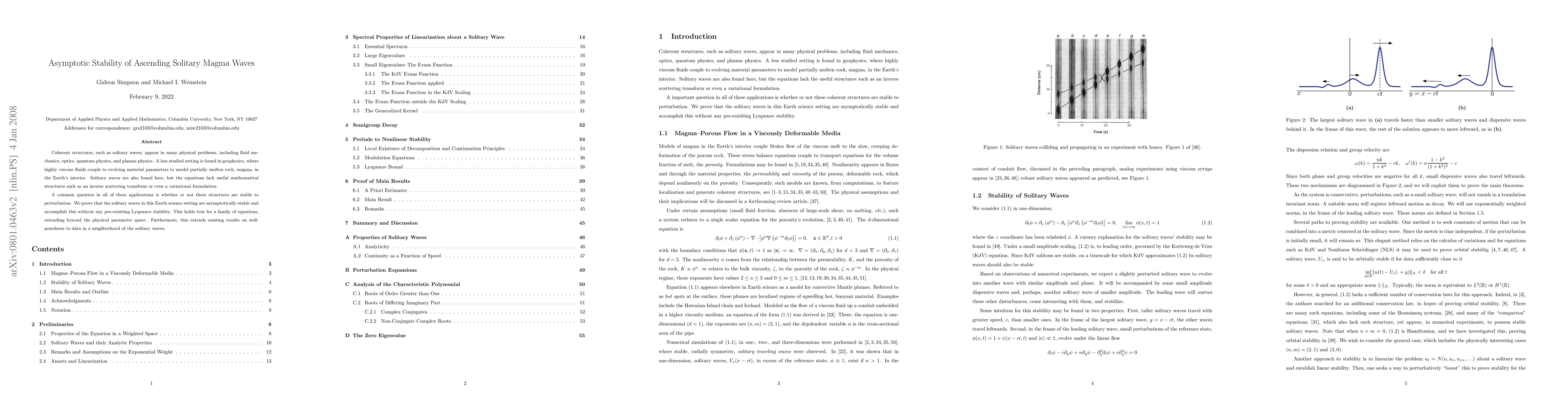 Coherent structures, such as solitary waves, appear in many physical problems, including fluid mechanics, optics, quantum physics, and plasma physics. A less studied setting is found in geophysics, where highly viscous fluids couple to evolving material parameters to model partially molten rock, magma, in the Earth's interior. Solitary waves are also found here, but the equations lack useful mathematical structures such as an inverse scattering transform or even a variational formulation. A common question in all of these applications is whether or not these structures are stable to perturbation. We prove that the solitary waves in this Earth science setting are asymptotically stable and accomplish this without any pre-exisiting Lyapunov stability. This holds true for a family of equations, extending beyond the physical parameter space. Furthermore, this extends existing results on well-posedness to data in a neighborhood of the solitary waves.