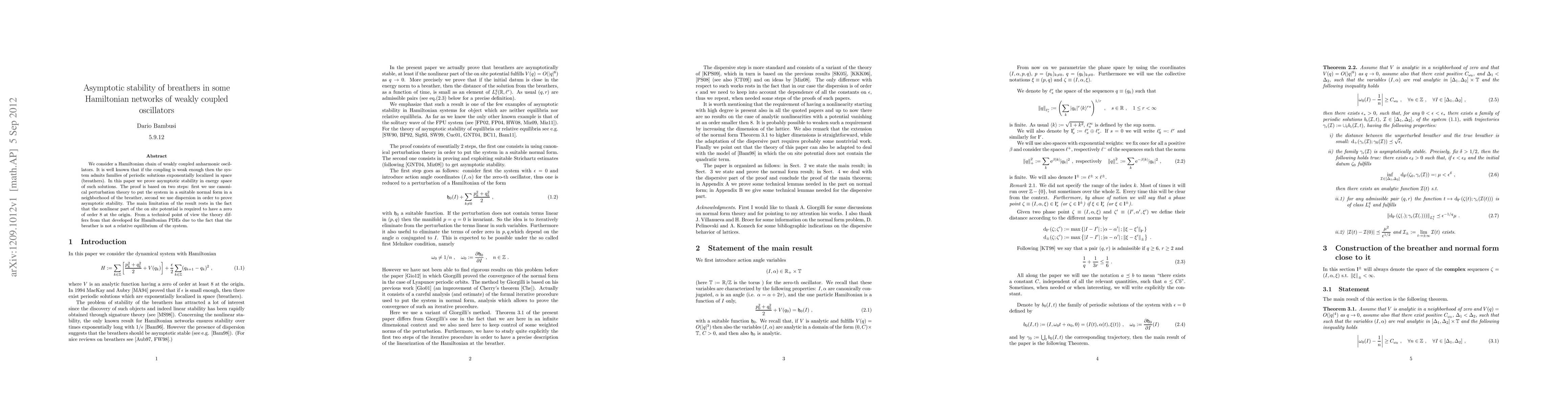 This paper proves the asymptotic stability of breathers in weakly coupled Hamiltonian oscillators using canonical perturbation theory and dispersion methods. The analysis requires the nonlinear part of the on-site potential to have a specific zero order at the origin, distinguishing it from stability theories for Hamiltonian PDEs.