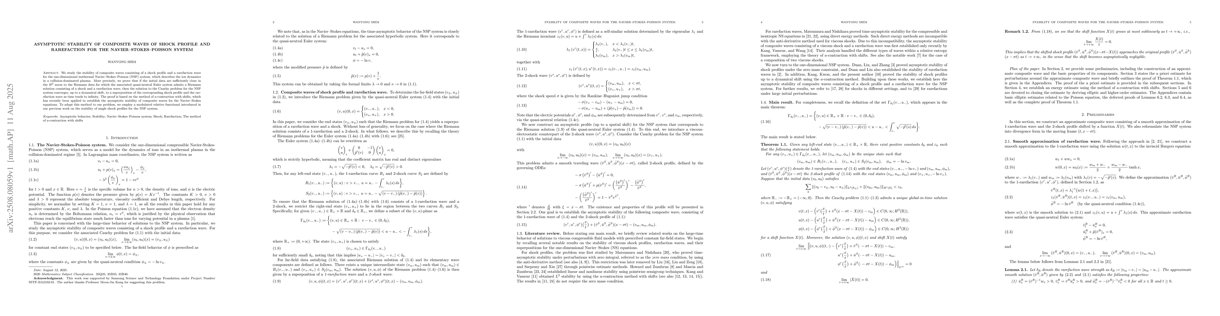 We study the stability of composite waves consisting of a shock profile and a rarefaction wave for the one-dimensional isothermal Navier--Stokes--Poisson (NSP) system, which describes the ion dynamics in a collision-dominated plasma. More precisely, we prove that if the initial data are sufficiently close in the $H^2$ norm to the Riemann data corresponding to a solution consisting of a shock and a rarefaction wave of the associated quasi-neutral Euler system, then the solution to the Cauchy problem for the NSP system converges, up to a dynamical shift, to a superposition of the corresponding shock profile and the rarefaction wave as time tends to infinity. Our proof is based on the method of $a$-contraction with shifts, which has recently been applied to the Navier--Stokes equations to establish the asymptotic stability of composite waves. To adapt this method to the NSP system, we employ a modulated relative functional introduced in our previous work on the stability of single shock profiles.