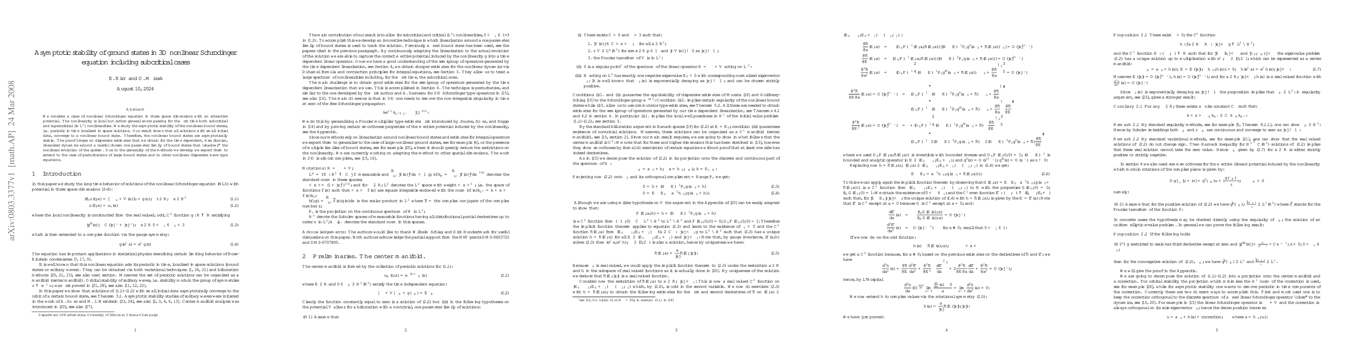 This paper investigates the asymptotic stability of localized solutions in a 3D nonlinear Schrödinger equation with both subcritical and supercritical nonlinearities. The authors prove that small perturbations of ground states converge to a stable nonlinear bound state, utilizing dispersive estimates and a "shadowing" technique for linearized dynamics.