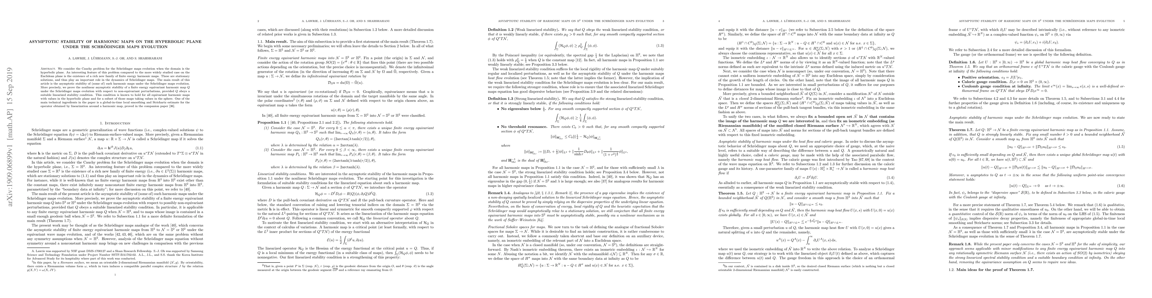This paper investigates the asymptotic stability of finite energy harmonic maps on the hyperbolic plane under the Schrödinger maps evolution, proving the nonlinear stability of certain harmonic maps provided they satisfy a linearized stability condition. The study leverages global-in-time local smoothing and Strichartz estimates from a companion paper.