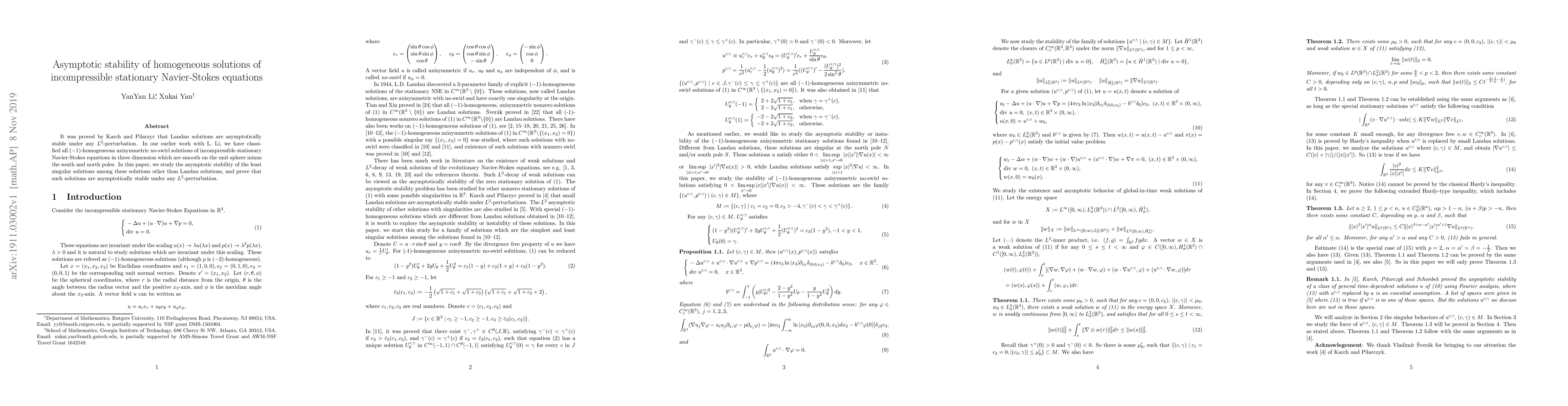 It was proved by Karch and Pilarzyc that Landau solutions are asymptotically stable under any $L^2$-perturbation. In our earlier work with L. Li, we have classified all $(-1)$-homogeneous axisymmetric no-swirl solutions of incompressible stationary Navier-Stokes equations in three dimension which are smooth on the unit sphere minus the south and north poles. In this paper, we study the asymptotic stability of the least singular solutions among these solutions other than Landau solutions, and prove that such solutions are asymptotically stable under any $L^2$-perturbation.