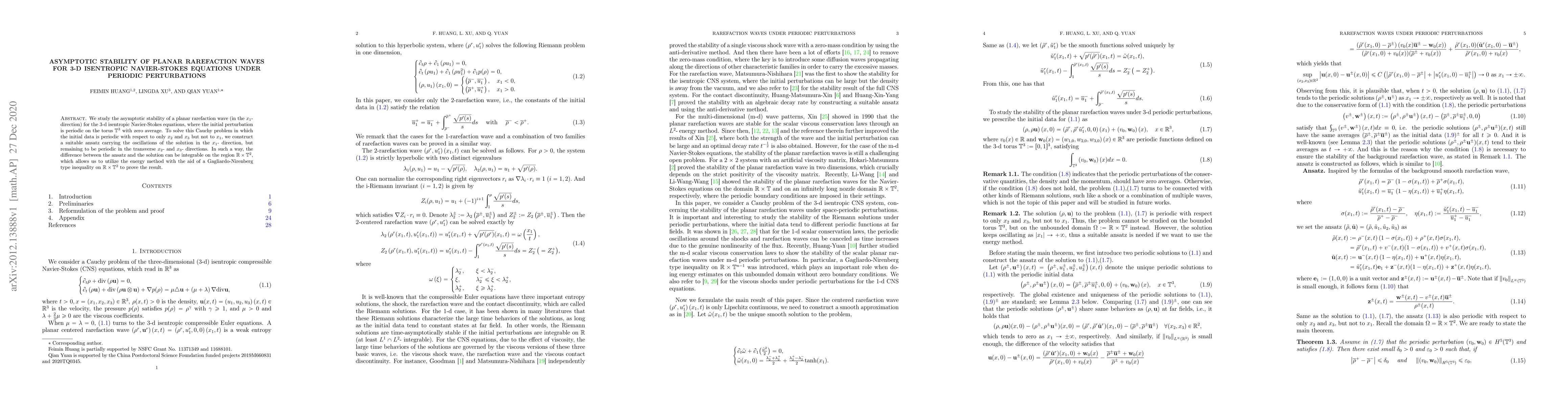 Researchers studied the stability of planar rarefaction waves in 3D isentropic Navier-Stokes equations under periodic perturbations. They found that these waves remain asymptotically stable when subjected to small initial perturbations.