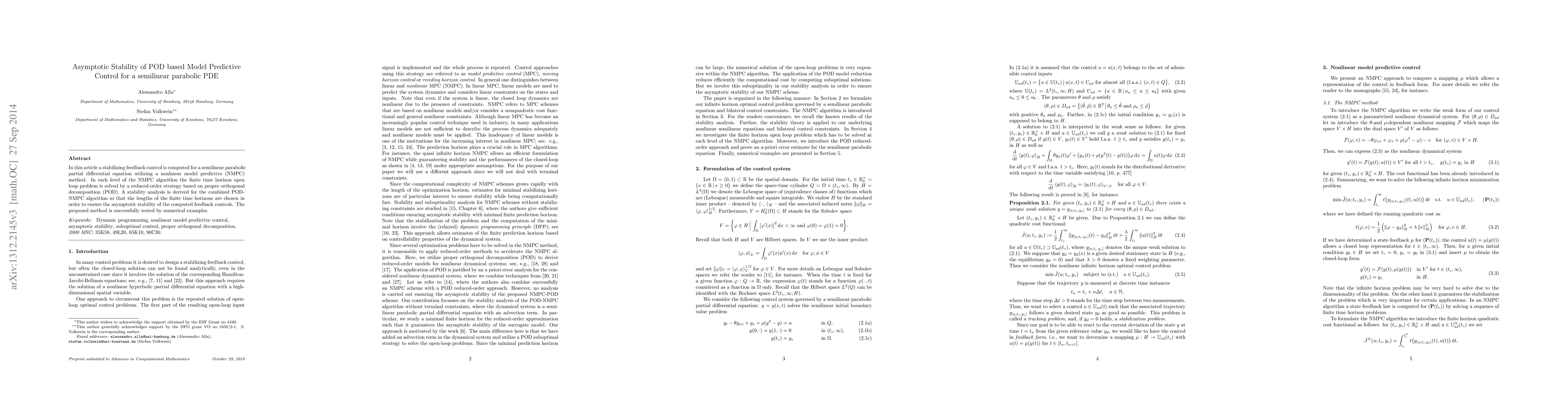 This paper develops a stabilizing feedback control for a semilinear parabolic PDE using a nonlinear model predictive control (NMPC) method with a reduced-order strategy based on proper orthogonal decomposition (POD). The authors provide a stability analysis to ensure asymptotic stability and validate the method through numerical examples.