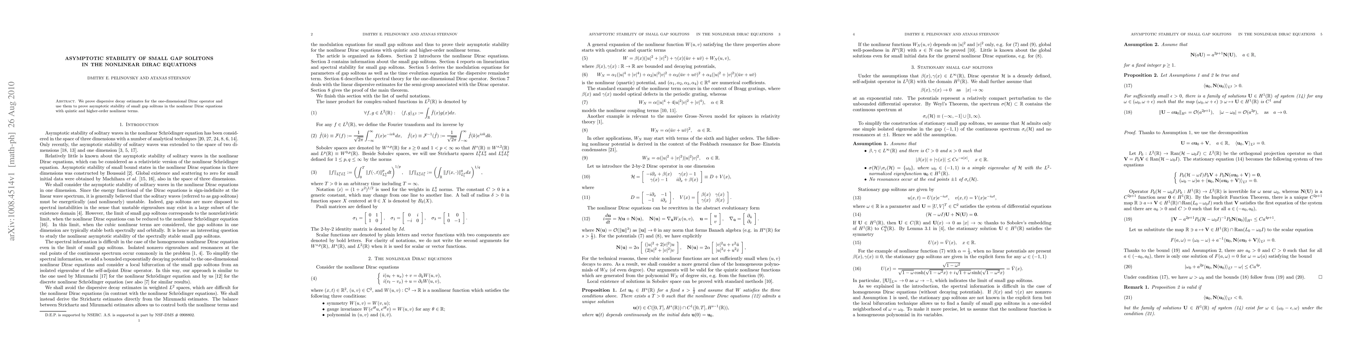 This paper proves dispersive decay estimates for the one-dimensional Dirac operator, which are then used to demonstrate the asymptotic stability of small gap solitons in nonlinear Dirac equations featuring quintic and higher-order nonlinearities.