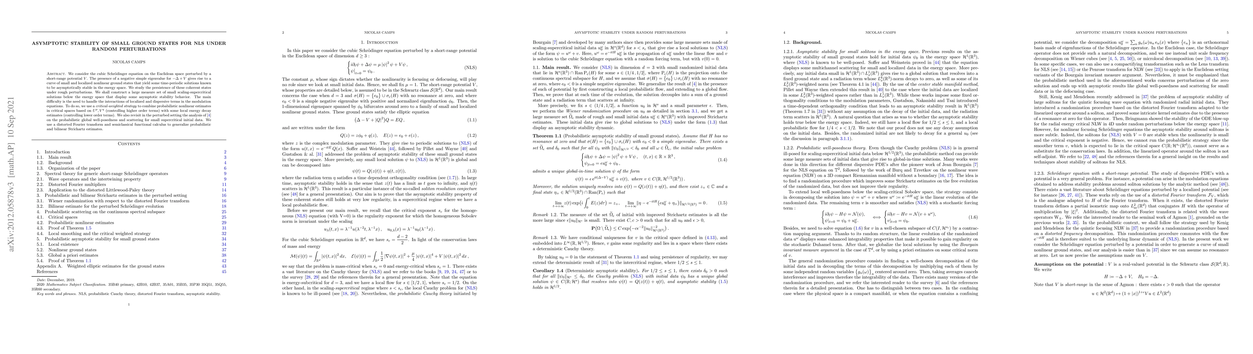 We consider the cubic Schr\"odinger equation on the euclidean space perturbed by a short-range potential $V$. The presence of a negative simple eigenvalue for $-\Delta+V$ gives rise to a curve of small and localized nonlinear ground states that yield some time-periodic solutions known to be asymptotically stable in the energy space. We study the persistence of these coherent states under rough perturbations. We shall construct a large measure set of small scaling-supercritical solutions below the energy space that display some asymptotic stability behavior. The main difficulty is the need to handle the interactions of localized and dispersive terms in the modulation equations. To do so, we use a critical-weighted strategy to combine probabilistic nonlinear estimates in critical spaces based on $U^p, V^q$ (controlling higher order terms) with some local energy decay estimates (controlling lower order terms). We also revisit in the perturbed setting the analysis of B\'enyi, Oh and Pocovnicu on the probabilistic global well-posedness and scattering for small supercritical initial data. We use a distorted Fourier transform and semiclassical functional calculus to generalize probabilistic and bilinear Strichartz estimates.