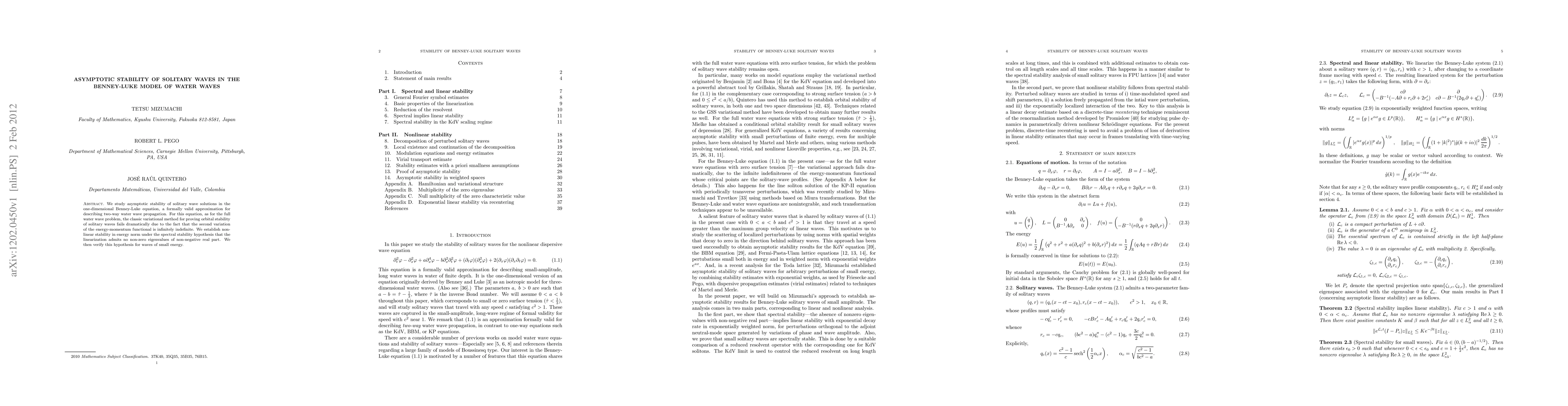 This paper investigates the asymptotic stability of solitary wave solutions in the Benney-Luke equation, a model for two-way water wave propagation. It establishes nonlinear stability in energy norm under the spectral stability condition that the linearization has no non-zero eigenvalues with non-negative real parts, and verifies this condition for small-energy waves.