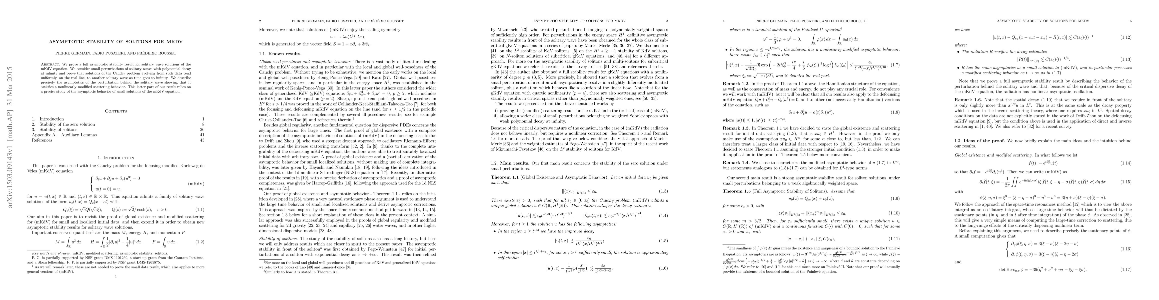 This paper proves the asymptotic stability of soliton solutions for the modified Korteweg-de Vries (mKdV) equation, demonstrating that small perturbations of solitary waves decay and evolve towards another solitary wave over time, with detailed analysis of the perturbation's nonlinear scattering behavior.