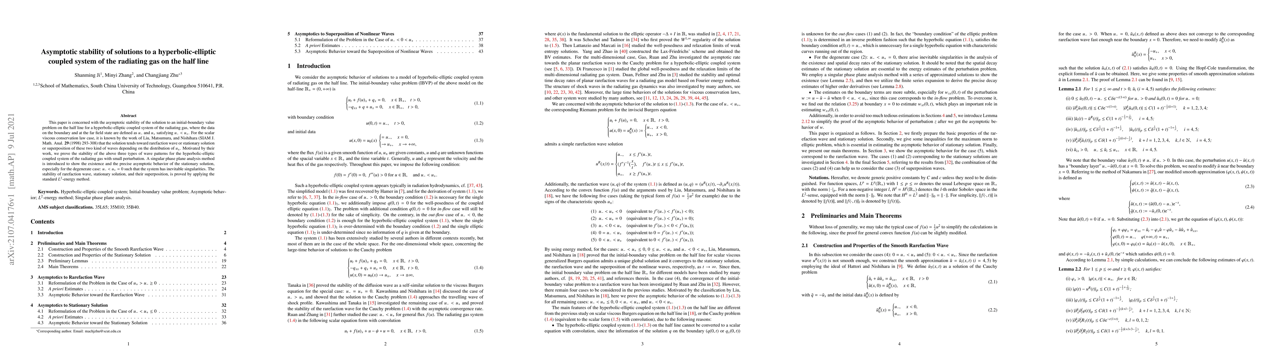 This paper investigates the asymptotic stability of solutions to a hyperbolic-elliptic coupled system of radiating gas on the half line, proving the stability of rarefaction waves, stationary solutions, and their superposition under small perturbations.
