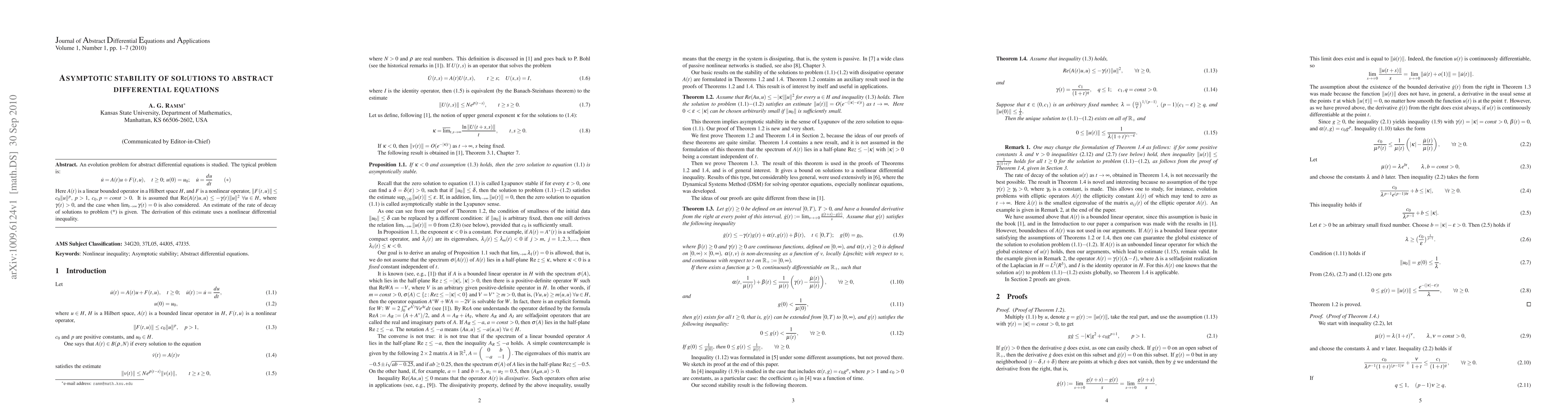 An evolution problem for abstract differential equations is studied. The typical problem is: $$\dot{u}=A(t)u+F(t,u), \quad t\geq 0; \,\, u(0)=u_0;\quad \dot{u}=\frac {du}{dt}\qquad (*)$$ Here $A(t)$ is a linear bounded operator in a Hilbert space $H$, and $F$ is a nonlinear operator, $\|F(t,u)\|\leq c_0\|u\|^p,\,\,p>1$, $c_0, p=const>0$. It is assumed that Re$(A(t)u,u)\leq -\gamma(t)\|u\|^2$ $\forall u\in H$, where $\gamma(t)>0$, and the case when $\lim_{t\to \infty}\gamma(t)=0$ is also considered. An estimate of the rate of decay of solutions to problem (*) is given. The derivation of this estimate uses a nonlinear differential inequality.