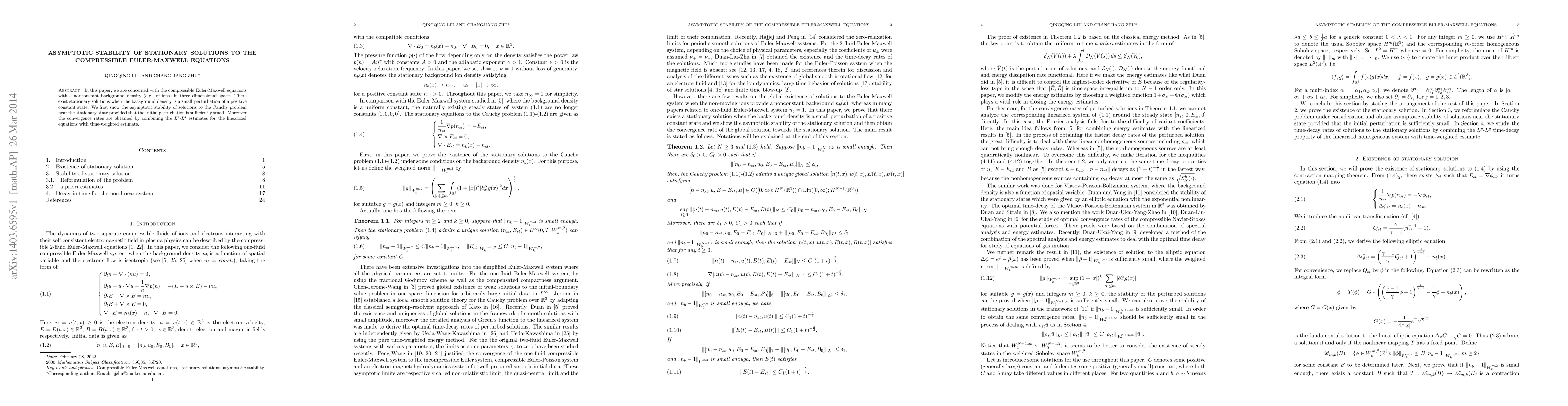 In this paper, we are concerned with the compressible Euler-Maxwell equations with a nonconstant background density (e.g. of ions) in three dimensional space. There exist stationary solutions when the background density is a small perturbation of a positive constant state. We first show the asymptotic stability of solutions to the Cauchy problem near the stationary state provided that the initial perturbation is sufficiently small. Moreover the convergence rates are obtained by combining the $L^p$-$L^q$ estimates for the linearized equations with time-weighted estimate.