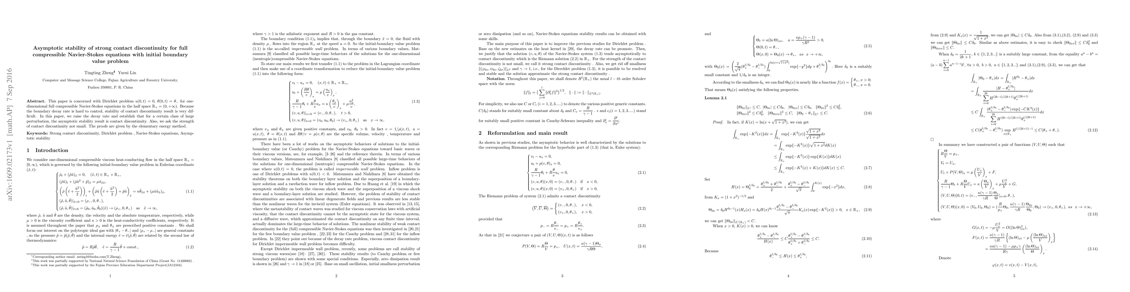 This paper is concerned with Dirichlet problem $u(0,t)=0$, $\theta(0,t)=\theta_-$ for one-dimensional full compressible Navier-Stokes equations in the half space $\R_+=(0,+\infty)$. Because the boundary decay rate is hard to control, stability of contact discontinuity result is very difficult. In this paper, we raise the decay rate and establish that for a certain class of large perturbation, the asymptotic stability result is contact discontinuity. Also, we ask the strength of contact discontinuity not small. The proofs are given by the elementary energy method.