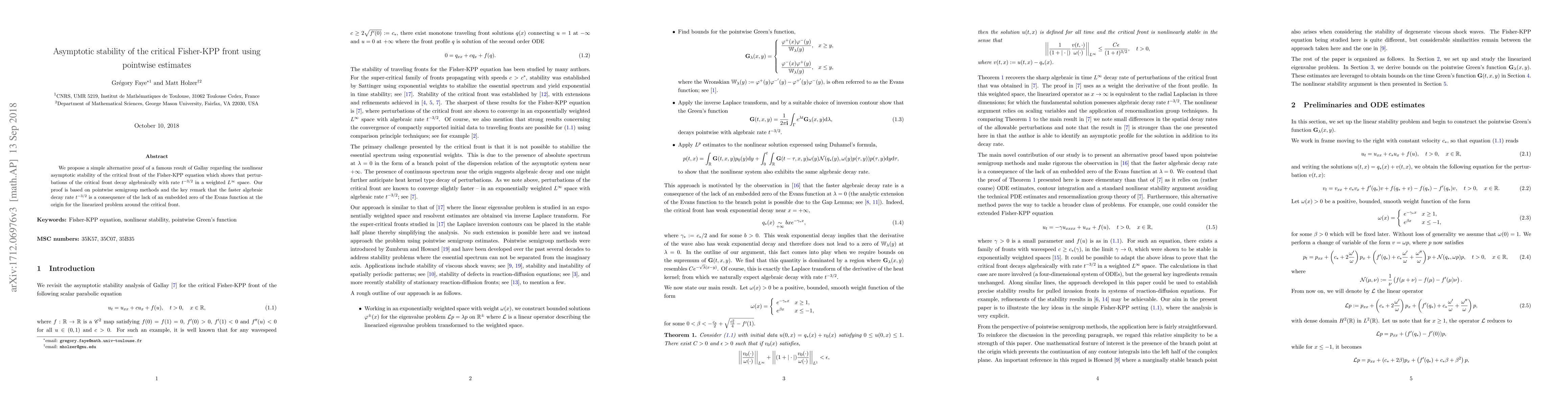 This paper presents an alternative proof of the asymptotic stability of the critical Fisher-KPP front, showing that perturbations decay algebraically with rate $t^{-3/2}$ using pointwise semigroup methods. The key insight is that the faster decay rate arises due to the absence of an embedded zero of the Evans function at the origin for the linearized problem.
