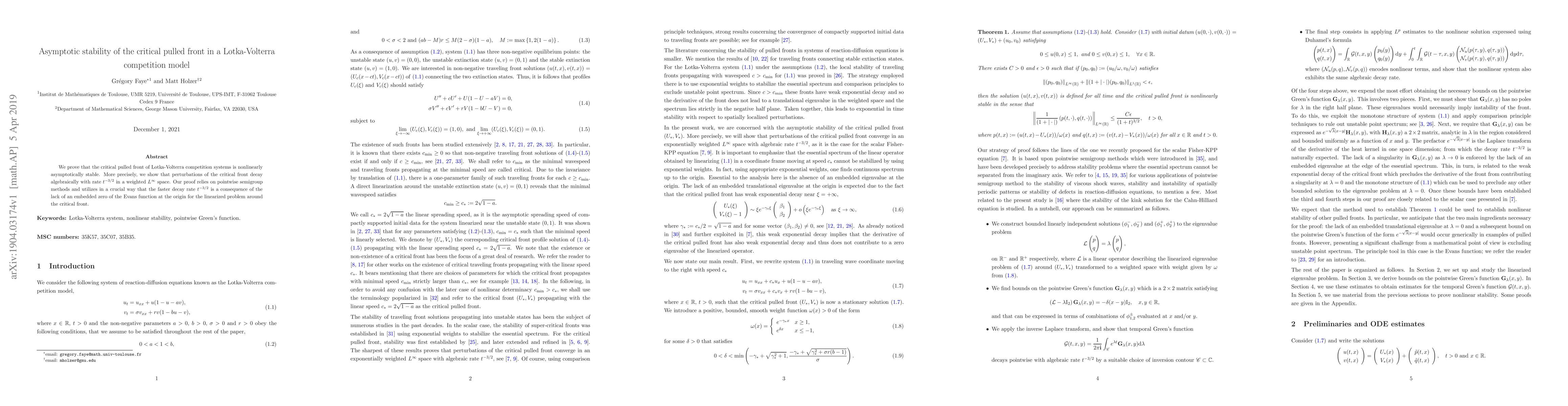 We prove that the critical pulled front of Lotka-Volterra competition systems is nonlinearly asymptotically stable. More precisely, we show that perturbations of the critical front decay algebraically with rate $t^{-3/2}$ in a weighted $L^\infty$ space. Our proof relies on pointwise semigroup methods and utilizes in a crucial way that the faster decay rate $t^{-3/2}$ is a consequence of the lack of an embedded zero of the Evans function at the origin for the linearized problem around the critical front.
