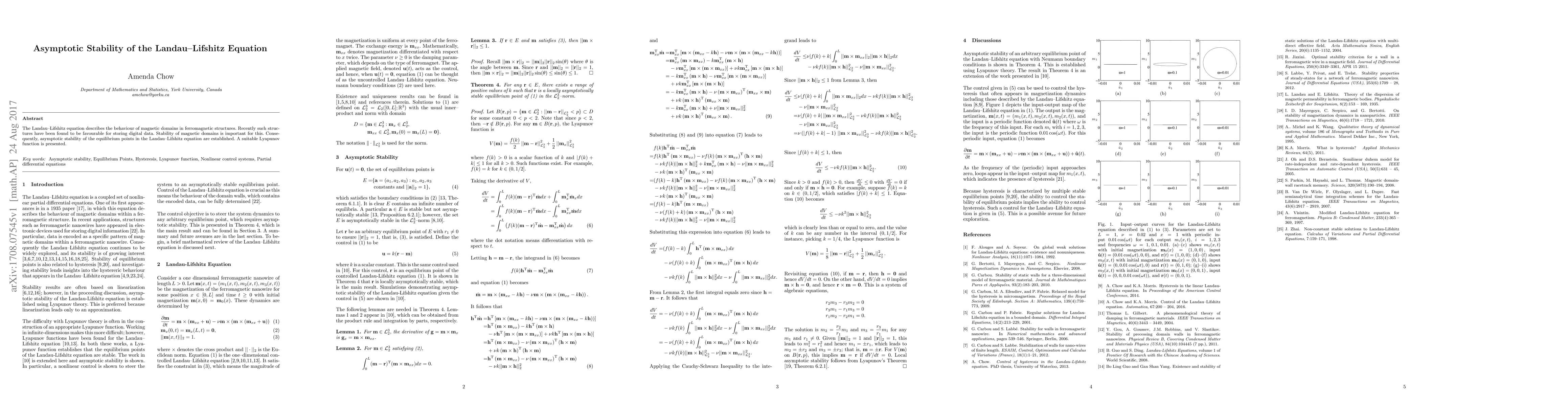 This paper establishes the asymptotic stability of equilibrium points in the Landau-Lifshitz equation, which models magnetic domains in ferromagnetic structures, crucial for digital data storage. A suitable Lyapunov function is introduced to demonstrate this stability.