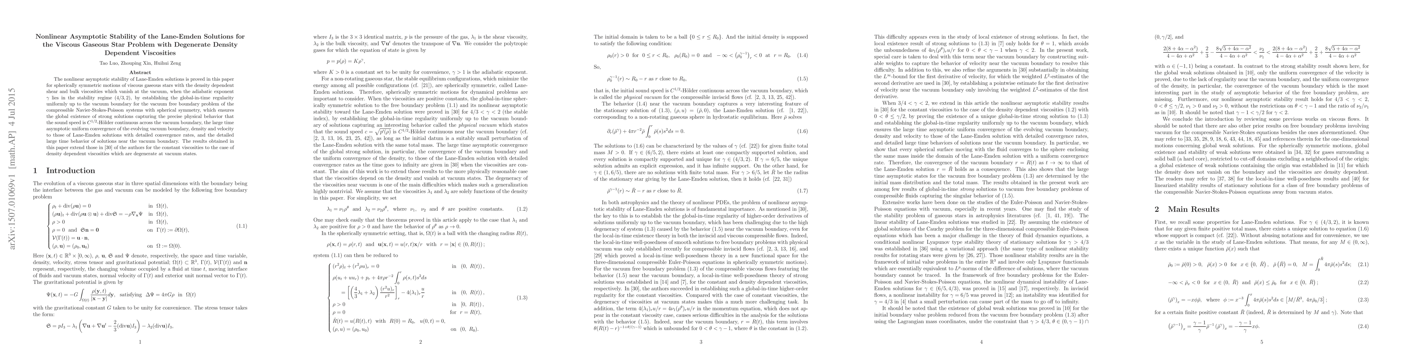 This paper proves the nonlinear asymptotic stability of Lane-Emden solutions for viscous gaseous stars with density-dependent viscosities that vanish at vacuum, when the adiabatic exponent $\gamma$ is within the stability regime $(4/3, 2)$. It establishes global-in-time regularity and convergence rates for the compressible Navier-Stokes-Poisson systems, extending previous results to degenerate density-dependent viscosities.