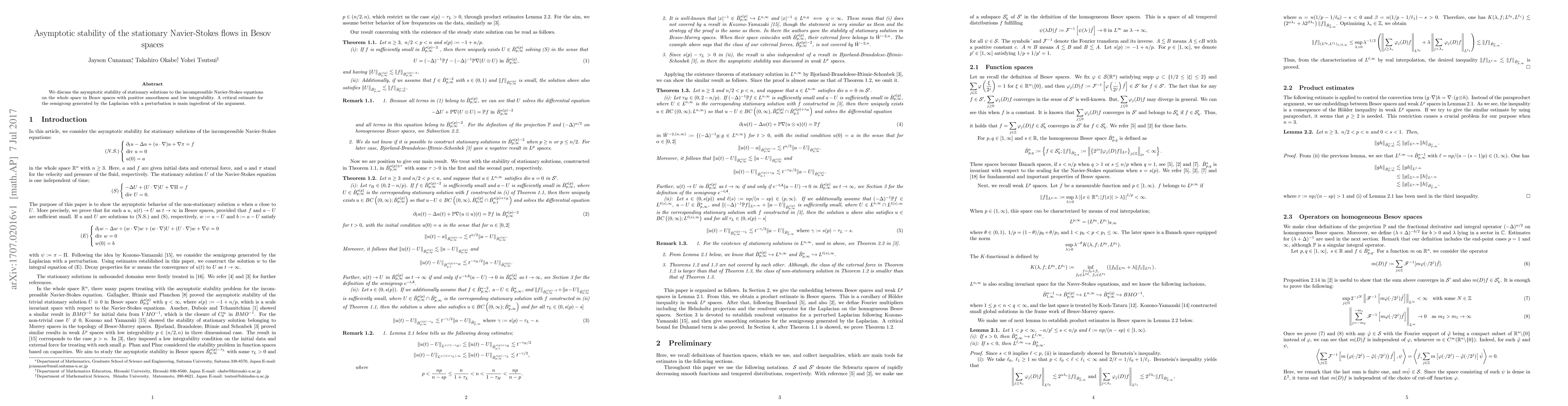 This paper investigates the asymptotic stability of stationary solutions to the incompressible Navier-Stokes equations in Besov spaces, utilizing a critical estimate for the perturbed semigroup generated by the Laplacian to support the findings.