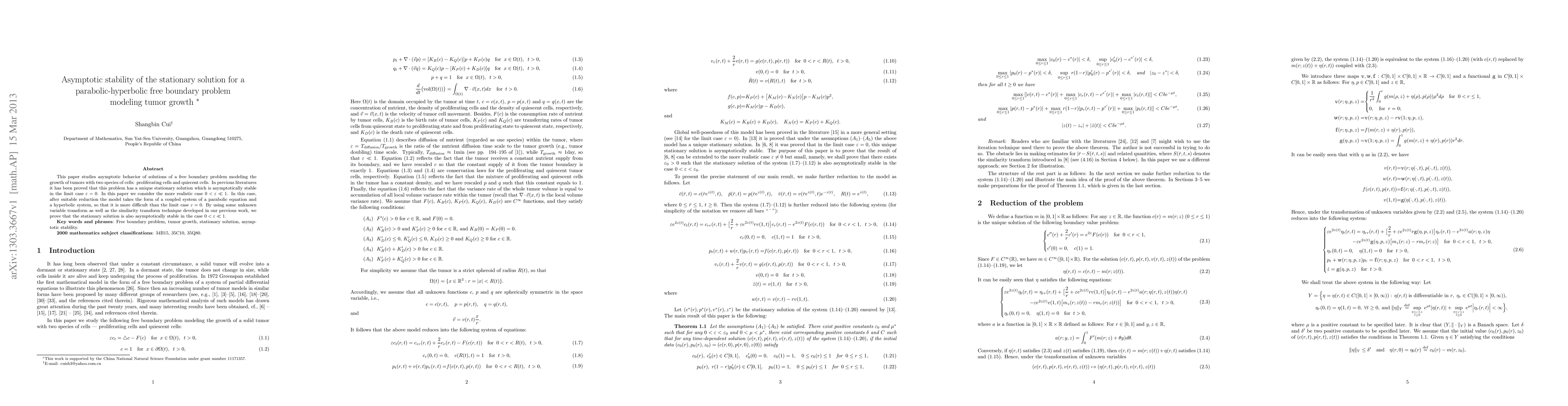 This paper investigates the asymptotic stability of the stationary solution for a coupled parabolic-hyperbolic free boundary problem modeling tumor growth with proliferating and quiescent cells. It proves the asymptotic stability of the stationary solution in the more realistic case where $0<\varepsilon<<1$, using advanced transformation techniques.