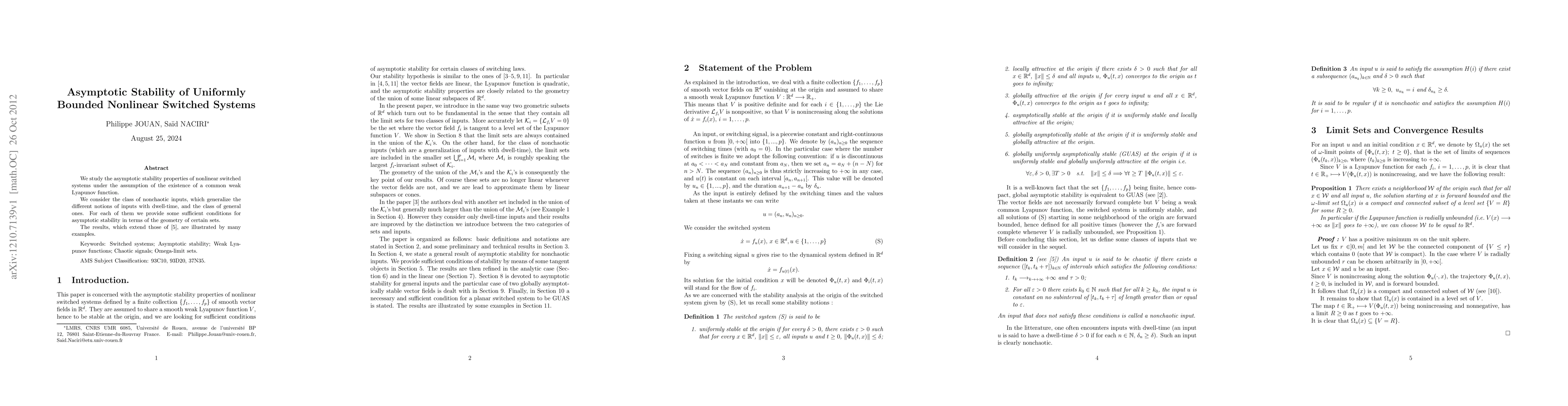 We study the asymptotic stability properties of nonlinear switched systems under the assumption of the existence of a common weak Lyapunov function. We consider the class of nonchaotic inputs, which generalize the different notions of inputs with dwell-time, and the class of general ones. For each of them we provide some sufficient conditions for asymptotic stability in terms of the geometry of certain sets. The results, which extend those of Balde, Jouan about linear systems, are illustrated by many examples.